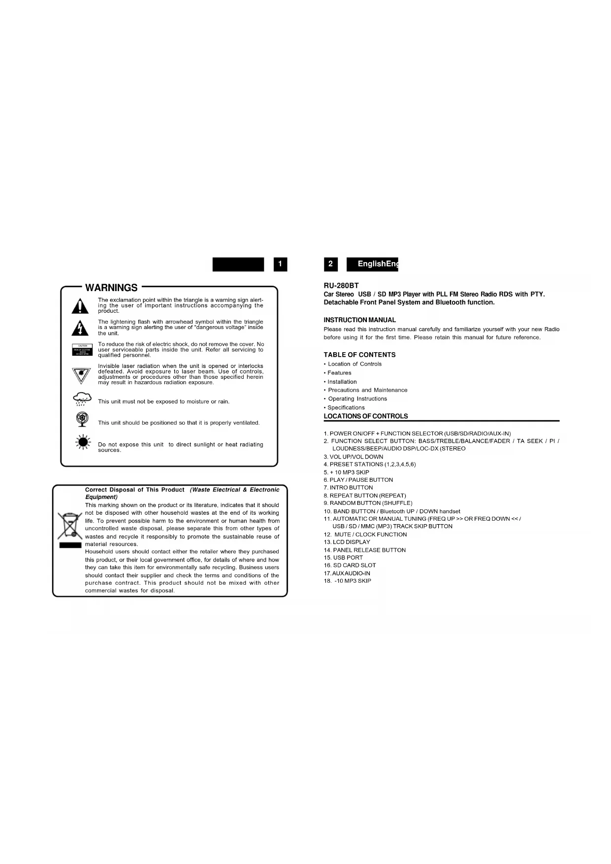 Download the instructions for your Car stereo in PDF format for free! Find your manual RU280BT - ROADSTAR and take your electronic device back in hand. On this page are published all the documents necessary for the use of your device. RU280BT by ROADSTAR.