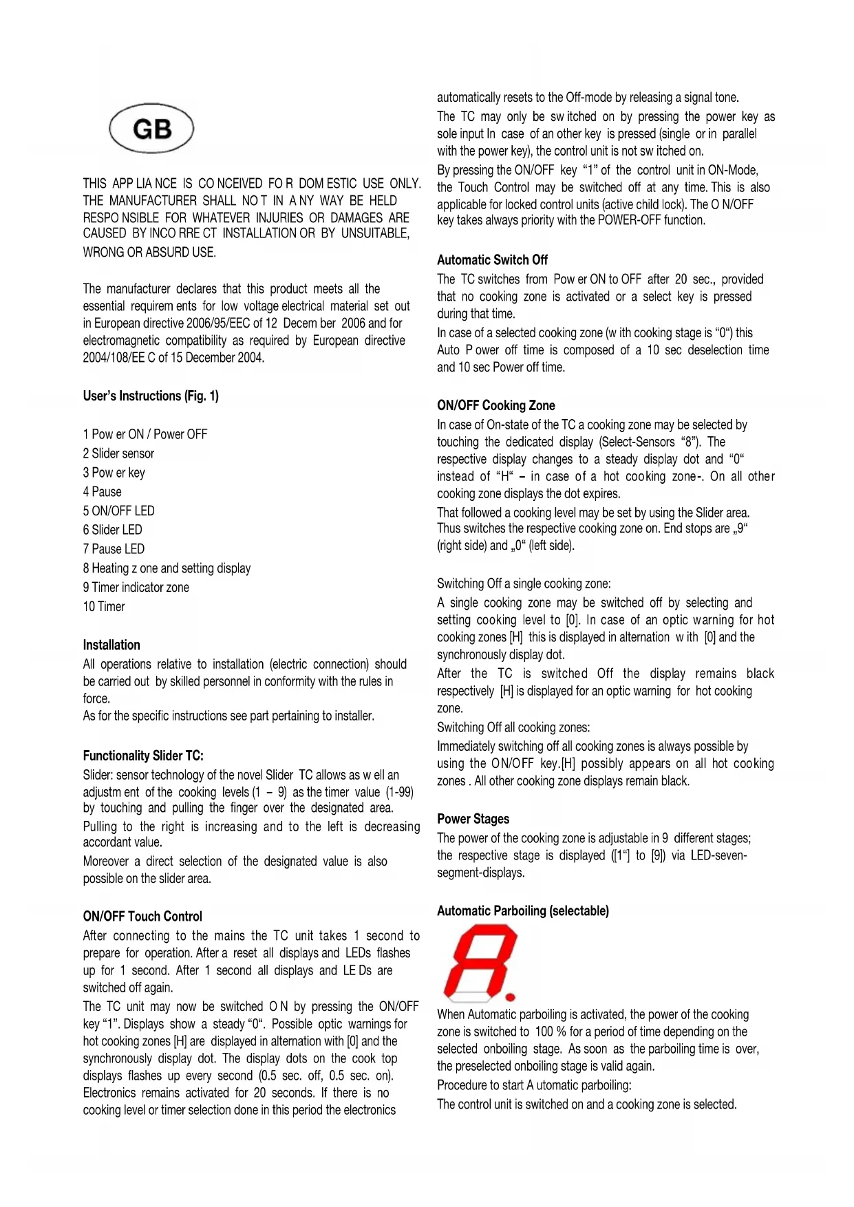The control unit is switched on and a cooking zone is selected.After setting cooking stage “9“ Automatic parboiling is activated