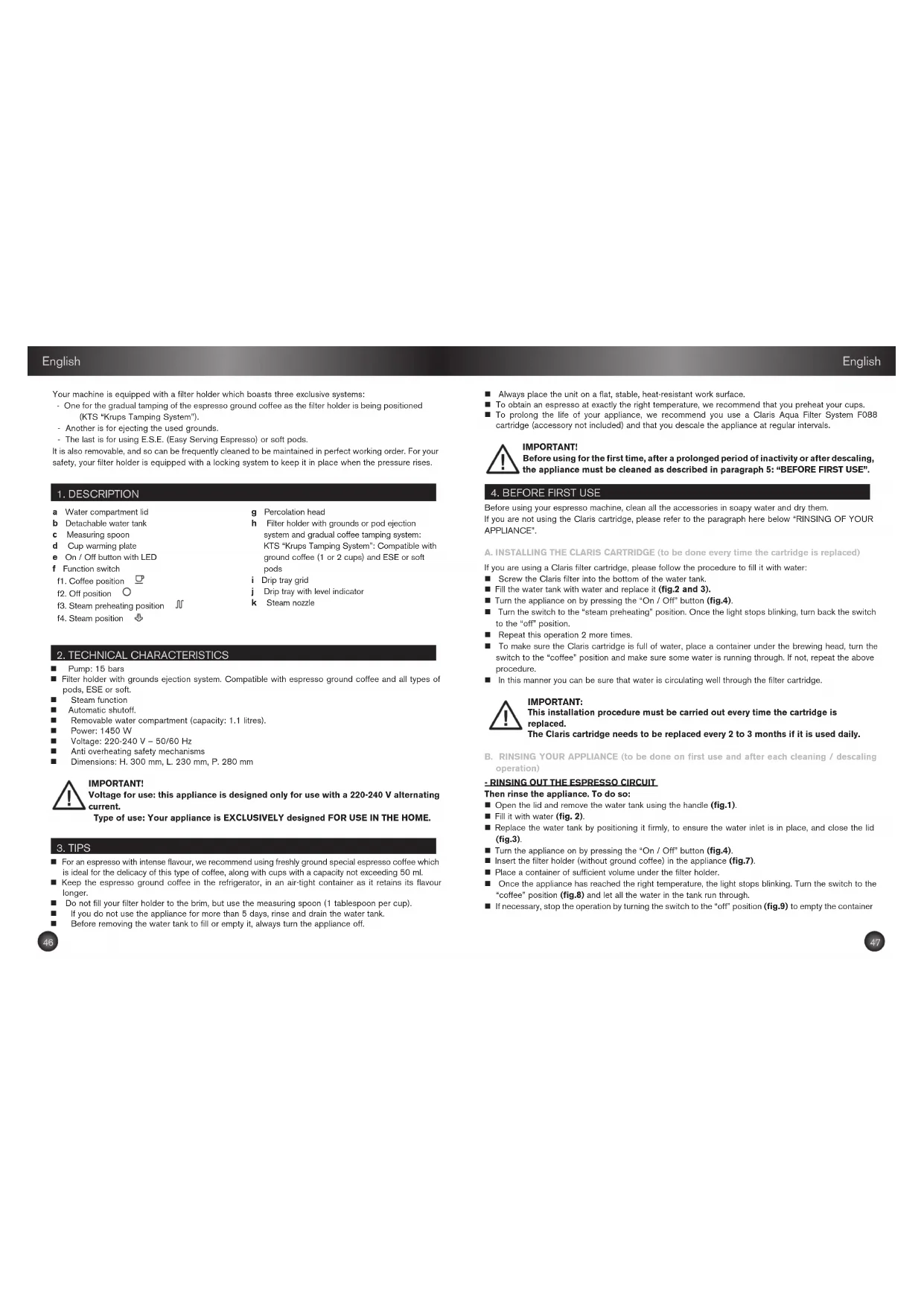 4. BEFORE FIRST USE Before using your espresso machine, clean all the accessories in soapy water and dry them.