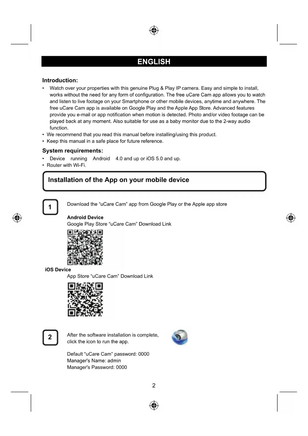 - Watch over your properties with this genuine Plug & Play IP camera. Easy and simple to install, works without the need for any form of configuration. The free uCare Cam app allows you to watch and listen to live footage on your Smartphone or other mobile devices, anytime and anywhere. The free uCare Cam app is available on Google Play and the Apple App Store. Advanced features provide you e-mail or app notification when motion is detected. Photo and/or video footage can be played back at any moment. Also suitable for use as a baby monitor due to the 2-way audio function.