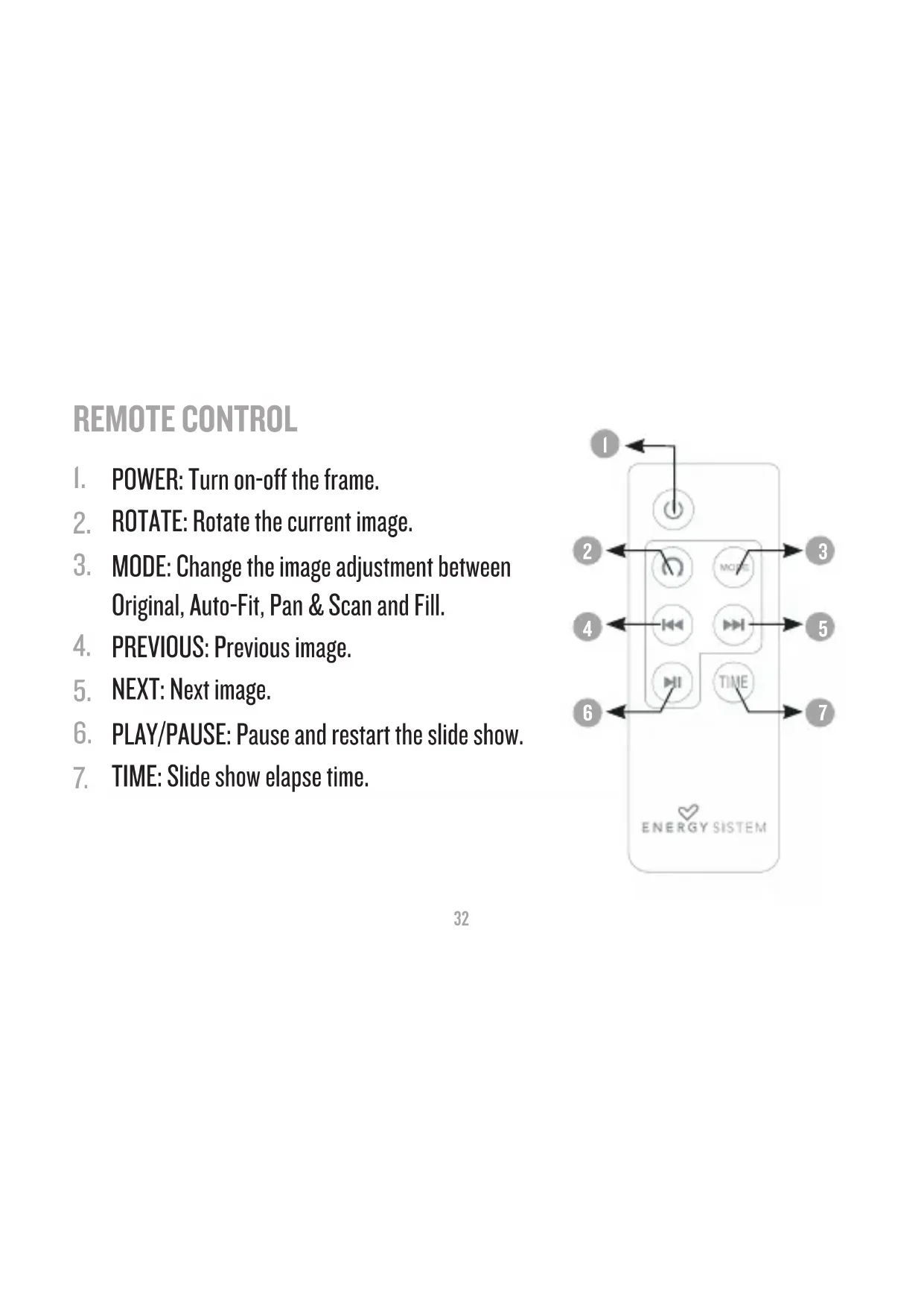 Do not disassemble the device. Any repairs must be performed by ≥ qualified Energy Sistem Soyntec’s personnel.29 MAIN FEATURES 7” TFT LCD high resolution display. ≥ 16:9 image format. ≥ 480x234 resolution. ≥ Slim remote control. ≥ Compatible with JPG pictures from the majority of digital cameras. ≥ Slide show with different time intervals available (5/15/60 sec. ≥ 5/15/30/45/60 min. Still). Compatible with Secure Digital (SD) / Multimedia Card (MMC) / Memory