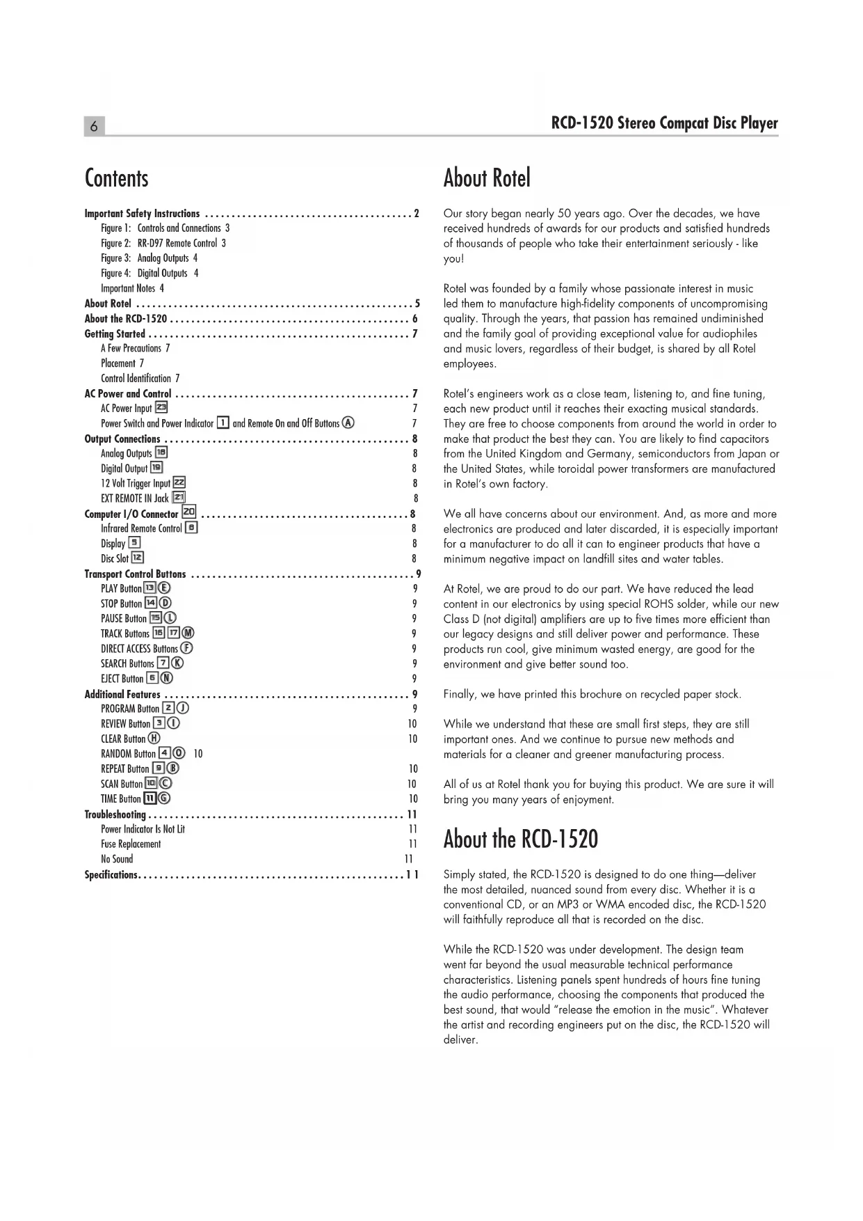 Troubleshooting . . . . . . . . . . . . . . . . . . . . . . . . . . . . . . . . . . . . . . . . . . . . . . . . 11 Power Indicator Is Not Lit 11Fuse Replacement 11No Sound 11Specifications ..................................................117 English That said, the RCD-1520 does feature some impressive hardware. The digital-to-analogue converter is a state of the art DAC from the world renowned British manufacturer, Wolfson. This very high performance stereo DAC is specifically designed for audio applications such as CD, DVD, and home theatre systems. All this, combined with Rotel’s Balanced Design, ensures the RCD-1520 will deliver the highest level of audio performance. When used in a high-quality audio system, your Rotel CD player will provide years of enjoyment. Getting Started A Few Precautions Please read this manual carefully. In addition to installation and operating instructions, it provides valuable information on various RCD-1520 system configurations as well as general information that will help you get optimum performance from your system. Please contact your authorized Rotel dealer for answers to any questions you might have. In addition, all of us at Rotel welcome your questions and comments. Save the RCD-1520 shipping carton and all enclosed packing material for future use. Shipping or moving the RCD-1520 in anything other than the original packing material may result in severe damage that is not covered by the warranty. Fill out and send in the owner’s registration card packed with the RCD-1520. Also be sure to keep the original sales receipt. It is your best record of the date of purchase, which you will need in the event warranty service is required. Placement Use common sense when placing the RCD-1520 in a cabinet or when stacking other equipment. Make sure that the shelf or cabinet can support its weight. Do not stack components on top of the RCD-1520. Avoid placing the unit where it may be subject to excessive heat such as on top of a large power amplifier or near a heat register. For best performance, avoid placing the unit where it may be subject to vibration, such as near a speaker. Control Identification The cover of this manual has a fold out panel that shows illustrations of the front and rear panels and the RR-D97 remote control. Each item in the illustrations is identified with a call out. Throughout this manual the items referred to in the text are identified by the corresponding call out. The items on the front and rear panels are identified with a number call out, such a