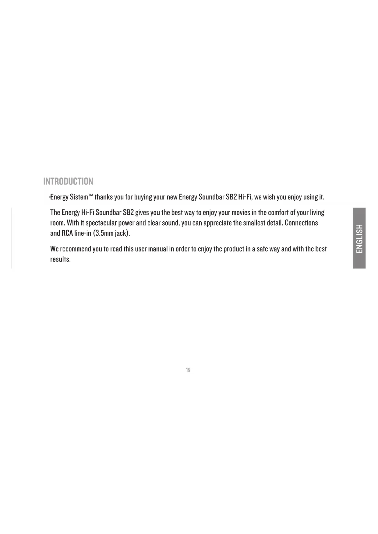 Energy Sistem™ thanks you for buying your new Energy Soundbar SB2 Hi-Fi, we wish you enjoy using it.