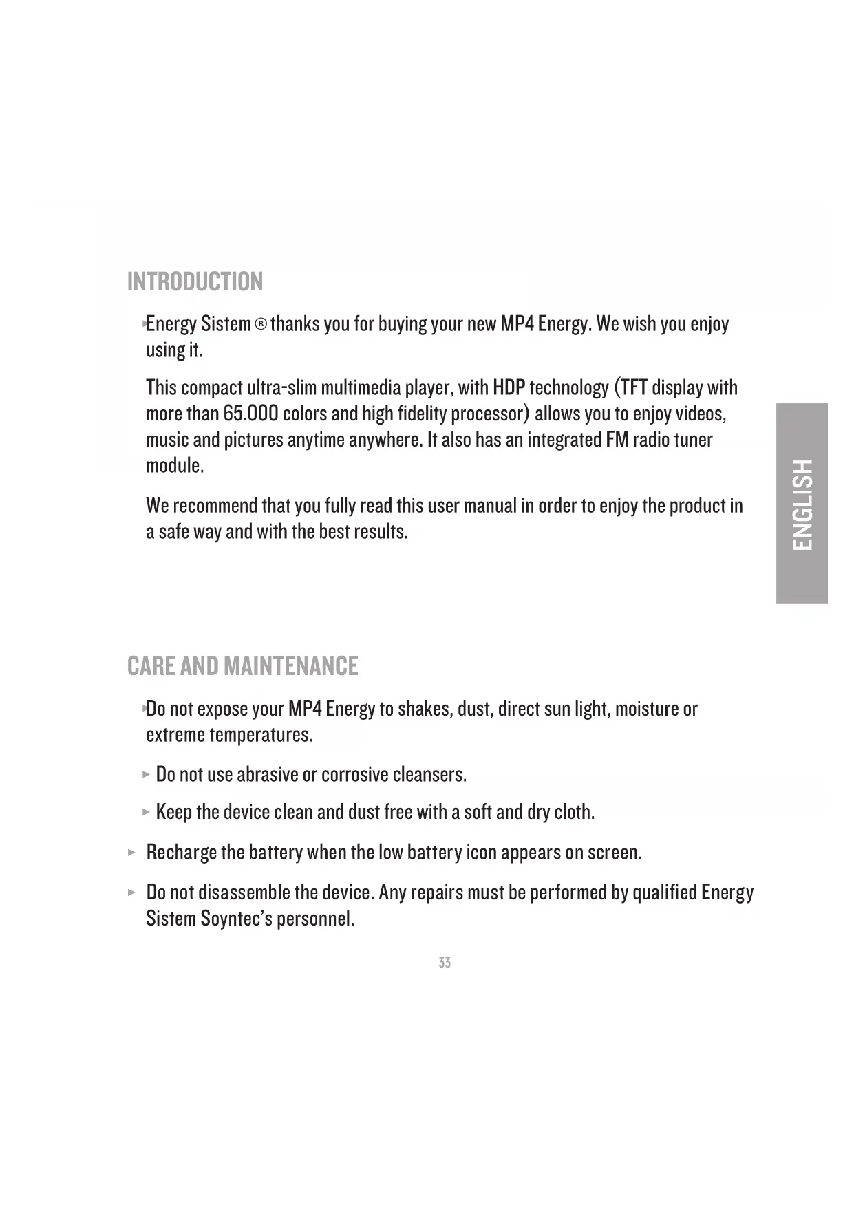 Do not expose your MP4 Energy to shakes, dust, direct sun light, moisture or extreme temperatures. ≥ Do not use abrasive or corrosive cleansers. ≥ Keep the device clean and dust free with a soft and dry cloth. ≥ Recharge the battery when the low battery icon appears on screen. ≥ Do not disassemble the device. Any repairs must be performed by qualified Energy Sistem Soyntec’s personnel.34 MAIN FEATURES
