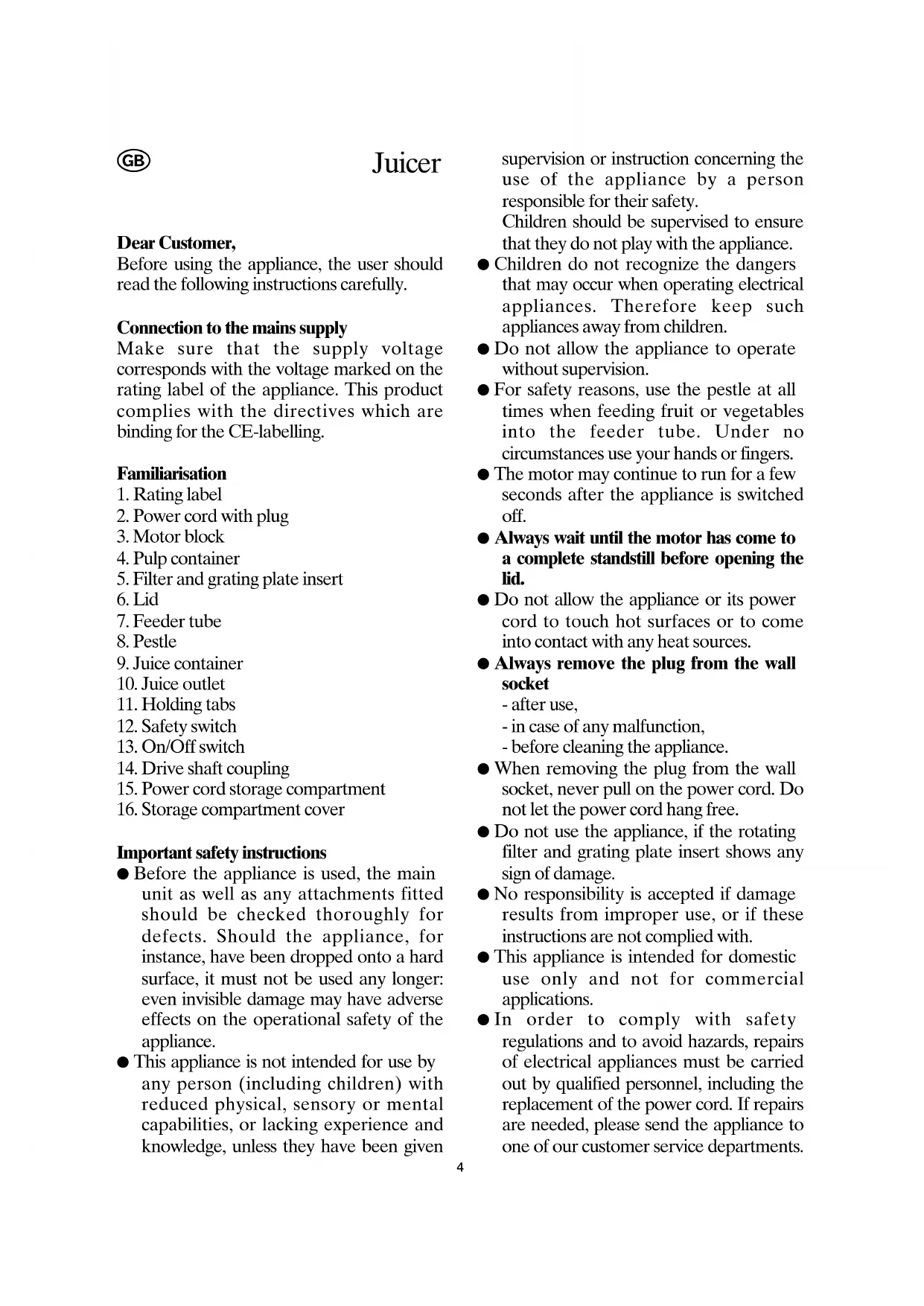 Important safety instructions ● Before the appliance is used, the main unit as well as any attachments fitted should be checked thoroughly for defects. Should the appliance, for instance, have been dropped onto a hard surface, it must not be used any longer: even invisible damage may have adverse effects on the operational safety of the appliance. ● This appliance is not intended for use by any person (including children) with reduced physical, sensory or mental capabilities, or lacking experience and knowledge, unless they have been given supervision or instruction concerning the use of the appliance by a person responsible for their safety. Children should be supervised to ensure that they do not play with the appliance. ● Children do not recognize the dangers that may occur when operating electrical appliances. Therefore keep such appliances away from children. ● Do not allow the appliance to operate without supervision. ● For safety reasons, use the pestle at all times when feeding fruit or vegetables into the feeder tube. Under no circumstances use your hands or fingers. ● The motor may continue to run for a few seconds after the appliance is switched off. ● Always wait until the motor has come to a complete standstill before opening the lid. ● Do not allow the appliance or its power cord to touch hot surfaces or to come into contact with any heat sources. ● Always remove the plug from the wall socket - after use, - in case of any malfunction, - before cleaning the appliance. ● When removing the plug from the wall socket, never pull on the power cord. Do not let the power cord hang free. ● Do not use the appliance, if the rotating filter and grating plate insert shows any sign of damage. ● No responsibility is accepted if damage results from improper use, or if these instructions are not complied with. ● This appliance is intended for domestic use only and not for commercial applications. ● In order to comply with safety regulations and to avoid hazards, repairs of electrical appliances must be carried out by qualified personnel, including the replacement of the power cord. If repairs are needed, please send the appliance to one of our customer service departments. Juicer