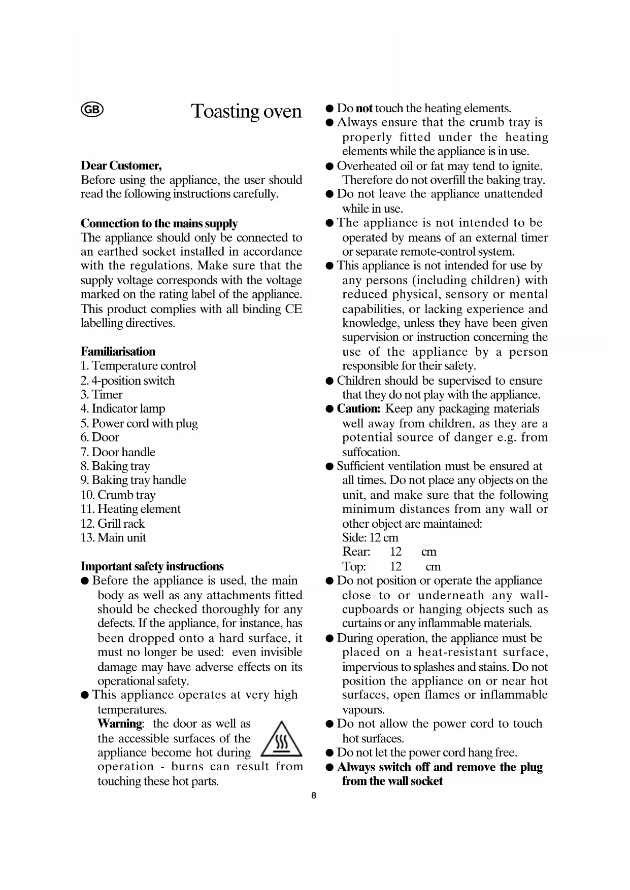 - Always ensure that the crumb tray is properly fitted under the heating elements while the appliance is in use.