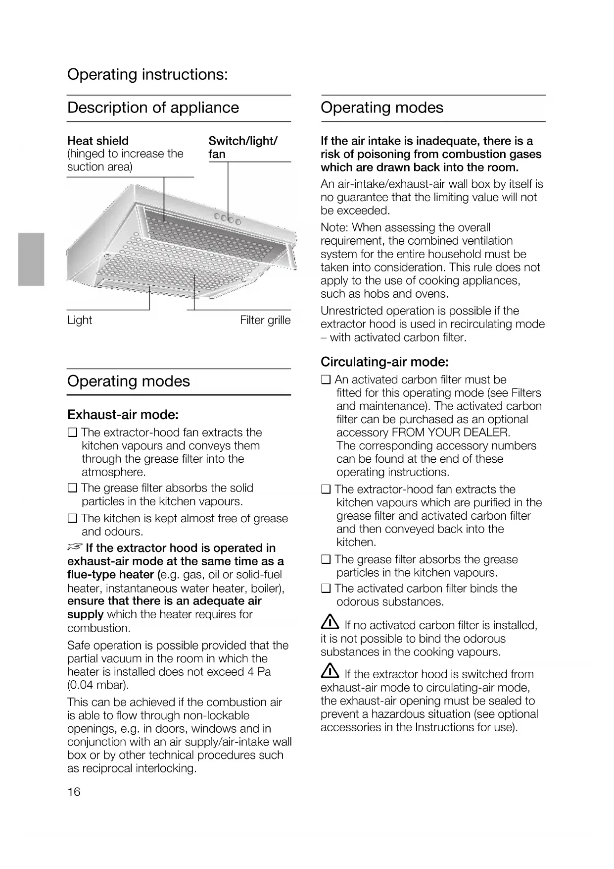 Important notes: ❑ The Instructions for Use apply to severalversions of this appliance. Accordingly,you may find descriptions of individualfeatures that do not apply to your specific appliance.❑ This extractor hood complies with all relevant safety regulations.Repairs should be carried out by qualified technicians only.Improper repairs may put the user atconsiderable risk. Do not flambé food directly under the extractor hood.Risk of grease filter catching fire due ! to flames.