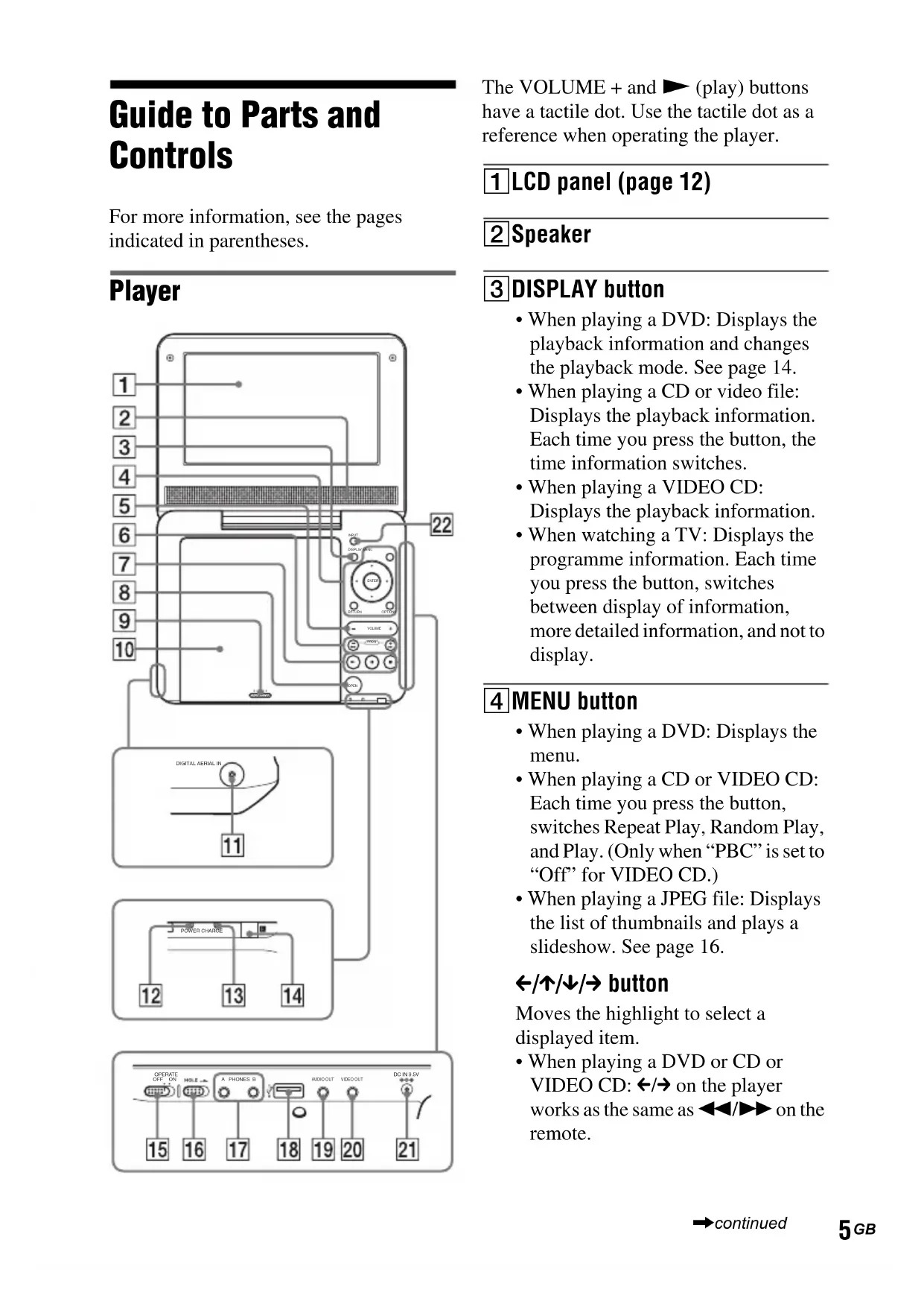 System Laser: Semiconductor laserSignal format system: PAL (NTSC)Transmission standards: DVB-TDigital Channel coverage: VHF/UHF Outputs VIDEO (video output): MinijackOutput 1.0 Vp-p/75 ohmsAUDIO (audio output)Stereo minijackOutput 2.0 Vrms/47 kilohmsRecommended load impedance over 47 kilohmsPHONES (headphones) A/B:Stereo minijack USB: USB jack Type A (For connecting USB memory)DIGITAL AERIAL IN:75 ohm external terminal for VHF/UHF Liquid Crystal Display Panel size: 7 inches wide (diagonal)Driving system: TFT active matrix Resolution: 480 × 234 (effective pixel rate: more than 99.99%) General Power requirements:DC 9.5 V (AC power Adaptor/Car battery adaptor)DC 7.4 V (rechargeable battery)Power consumption (DVD VIDEO Playback):7 W (when used with a headphone) Dimensions (approx.): 200 × 39.5 × 155 mm (width/height/depth) incl. projecting partsMass (approx.): 880 g Operating temperature: 5 ° C to 35 ° C Operating humidity: 25 % to 80 % AC Power Adaptor: 110-240 V AC, 50/60 Hz Car Battery Adaptor: 12 V DC Supplied accessories See page 9.Specifications and design are subject to change without notice. ALL