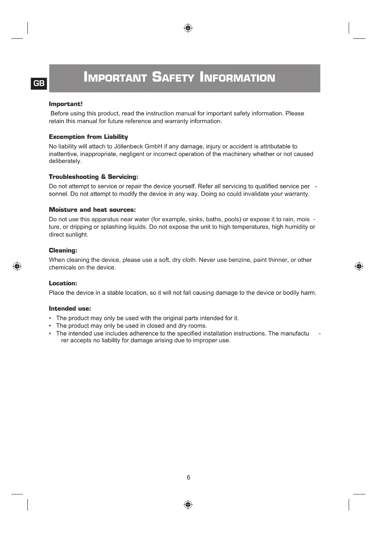No liability will attach to Jöllenbeck GmbH if any damage, injury or accident is attributable to inattentive, inappropriate, negligent or incorrect operation of the machinery whether or not caused deliberately.