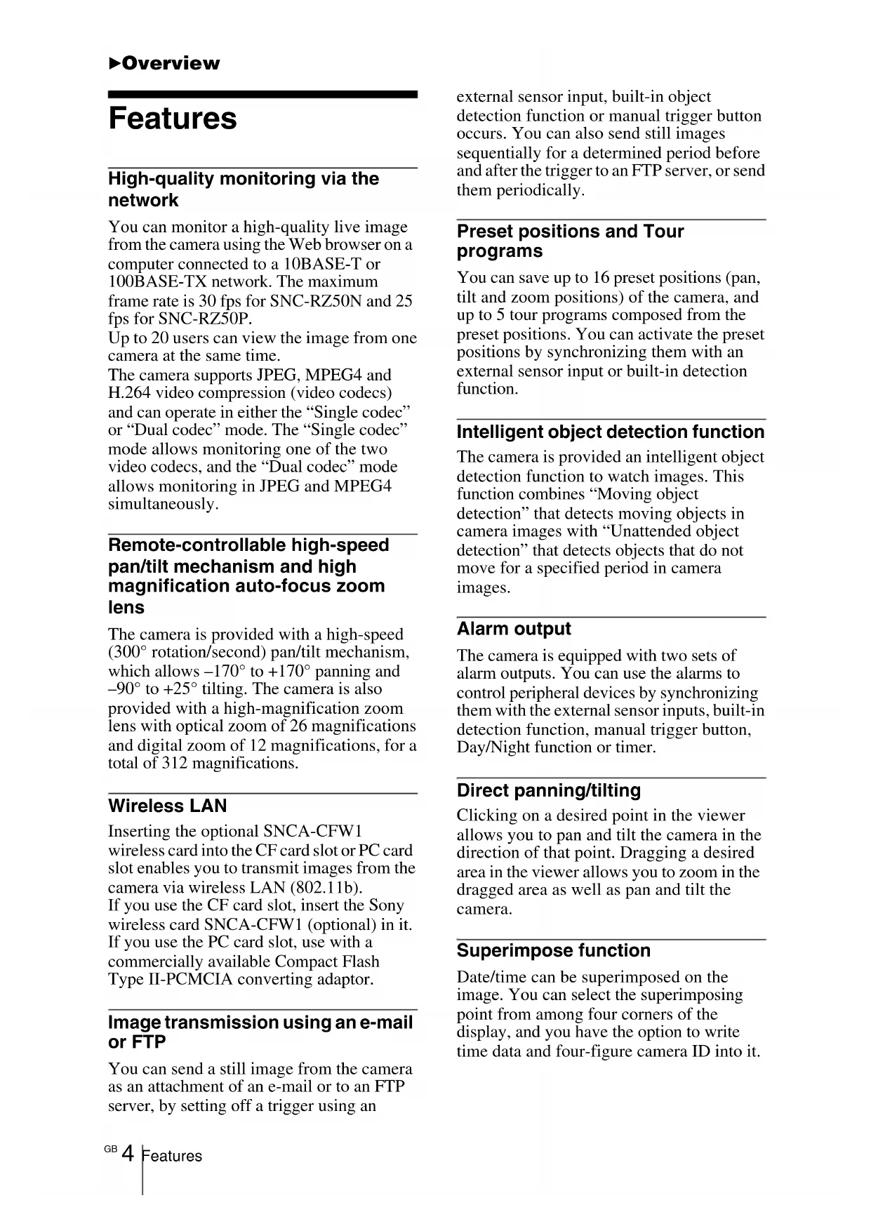 - When You Discard the Camera GB 4 Features B Overview Features High-quality monitoring via the network You can monitor a high-quality live image from the camera using the Web browser on a computer connected to a 10BASE-T or 100BASE-TX network. The maximum frame rate is 30 fps for SNC-RZ50N and 25 fps for SNC-RZ50P. Up to 20 users can view the image from one camera at the same time. The camera supports JPEG, MPEG4 and H.264 video compression (video codecs) and can operate in either the “Single codec” or “Dual codec” mode. The “Single codec” mode allows monitoring one of the two video codecs, and the “Dual codec” mode allows monitoring in JPEG and MPEG4 simultaneously. Remote-controllable high-speed pan/tilt mechanism and high magnification auto-focus zoom lens The camera is provided with a high-speed (300° rotation/second) pan/tilt mechanism, which allows –170° to +170° panning and –90° to +25° tilting. The camera is also provided with a high-magnification zoom lens with optical zoom of 26 magnifications and digital zoom of 12 magnifications, for a total of 312 magnifications. Wireless LAN Inserting the optional SNCA-CFW1 wireless card into the CF card slot or PC card slot enables you to transmit images from the camera via wireless LAN (802.11b). If you use the CF card slot, insert the Sony wireless card SNCA-CFW1 (optional) in it. If you use the PC card slot, use with a commercially available Compact Flash Type II-PCMCIA converting adaptor. Image transmission using an e-mail or FTP You can send a still image from the camera as an attachment of an e-mail or to an FTP server, by setting off a trigger using an external sensor input, built-in object detection function or manual trigger button occurs. You can also send still images sequentially for a determined period before and after the trigger to an FTP server, or send them periodically. Preset positions and Tour programs You can save up to 16 preset positions (pan, tilt and zoom positions) of the camera, and up to 5 tour programs composed from the preset positions. You can activate the preset positions by synchronizing them with an external sensor input or built-in detection function. Intelligent object detection function The camera is provided an intelligent object detection function to watch images. This function combines “Moving object detection” that detects moving objects in camera images with “Unattended object detection” that detects objects that do not move for a specified period in camera images. Alarm output The camera is equipped with two sets of alarm outputs. You can use the alarms to control peripheral devices by synchronizing them with the external sensor inputs, built-in detection function, manual trigger button, Day/Night function or timer. Direct panning/tilting Clicking on a desired point in the viewer allows you to pan and tilt the camera in the direction of that point. Dragging a desired area in the viewer allows you to zoom in the dragged area as well as pan and tilt the camera. Superimpose function Date/time can be superimposed on the image. You can select the superimposing point from among four corners of the display, and you have the option to write time data and four-figure camera ID into it.5 p. 32