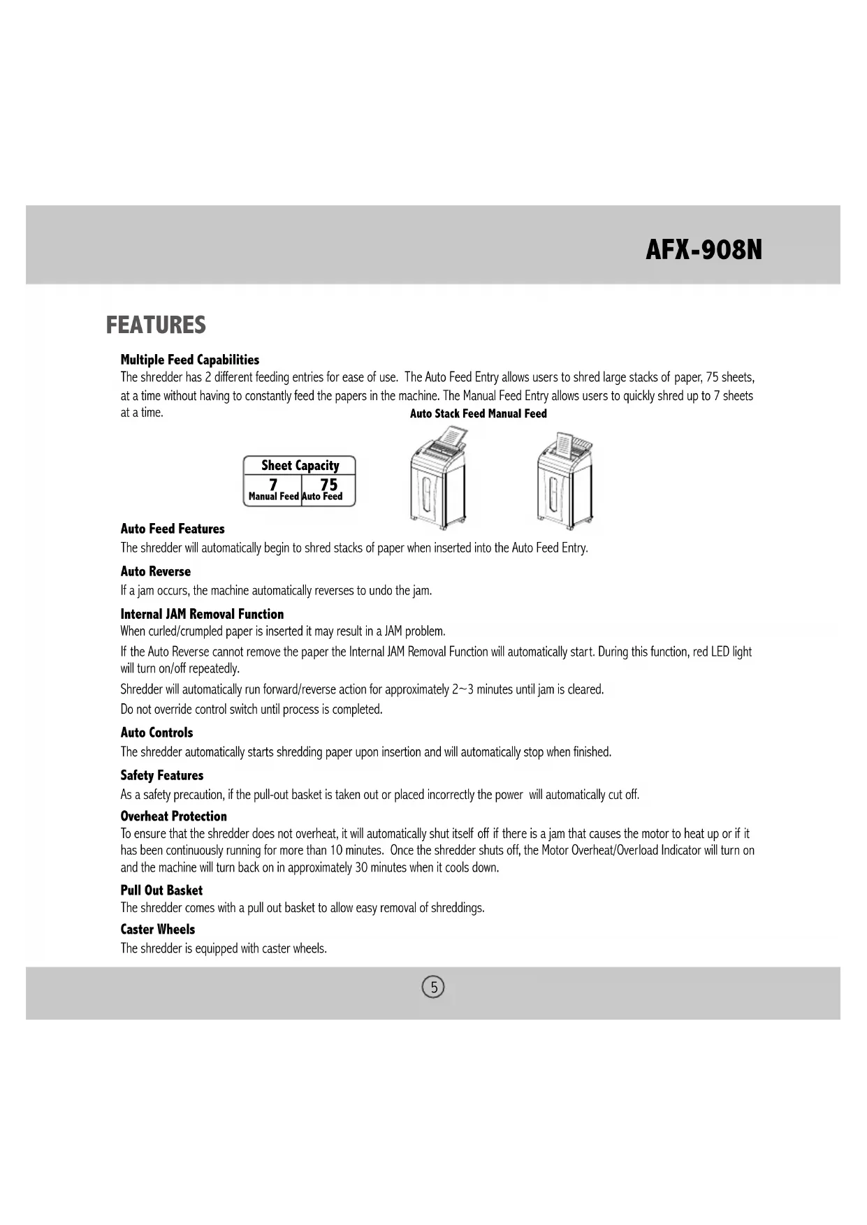FEATURES Multiple Feed Capabilities The shredder has 2 different feeding entries for ease of use. The Auto Feed Entry allows users to shred large stacks of paper, 75 sheets, at a time without having to constantly feed the papers in the machine. The Manual Feed Entry allows users to quickly shred up to 7 sheets at a time. Auto Feed Features The shredder will automatically begin to shred stacks of paper when inserted into the Auto Feed Entry. Auto Reverse If a jam occurs, the machine automatically reverses to undo the jam. Internal JAM Removal Function When curled/crumpled paper is inserted it may result in a JAM problem. If the Auto Reverse cannot remove the paper the Internal JAM Removal Function will automatically start. During this function, red LED light will turn on/off repeatedly. Shredder will automatically run forward/reverse action for approximately 2~3 minutes until jam is cleared. Do not override control switch until process is completed. Auto Controls The shredder automatically starts shredding paper upon insertion and will automatically stop when finished. Safety Features As a safety precaution, if the pull-out basket is taken out or placed incorrectly the power will automatically cut off. Overheat Protection To ensure that the shredder does not overheat, it will automatically shut itself off if there is a jam that causes the motor to heat up or if it has been continuously running for more than 10 minutes. Once the shredder shuts off, the Motor Overheat/Overload Indicator will turn on and the machine will turn back on in approximately 30 minutes when it cools down. Pull Out Basket The shredder comes with a pull out basket to allow easy removal of shreddings. Caster Wheels The shredder is equipped with caster wheels. Sheet Capacity Manual Feed Auto Feed Auto Stack Feed Manual Feed6 OPERATION