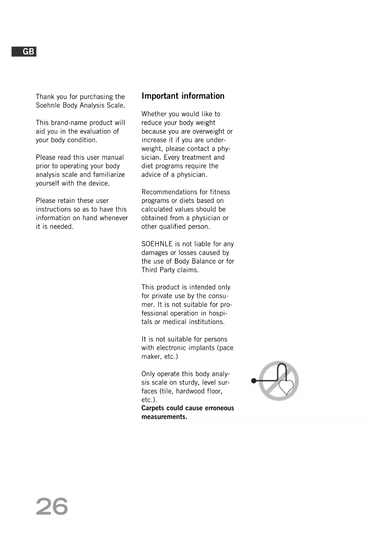 Thank you for purchasing the Soehnle Body Analysis Scale. This brand-name product will aid you in the evaluation of your body condition. Please read this user manual prior to operating your body analysis scale and familiarize yourself with the device. Please retain these user instructions so as to have this information on hand whenever it is needed. Important information Whether you would like to reduce your body weight because you are overweight or increase it if you are under- weight, please contact a phy- sician. Every treatment and diet programs require the advice of a physician. Recommendations for fitness programs or diets based on calculated values should be obtained from a physician or other qualified person. SOEHNLE is not liable for any damages or losses caused by the use of Body Balance or for Third Party claims. This product is intended only for private use by the consu- mer. It is not suitable for pro- fessional operation in hospi- tals or medical institutions. It is not suitable for persons with electronic implants (pace maker, etc.) Only operate this body analy- sis scale on sturdy, level sur- faces (tile, hardwood floor, etc.). Carpets could cause erroneous measurements. BA63730_FT4_GB.qxd 12.09.2007 9:15 Uhr Seite 26GB