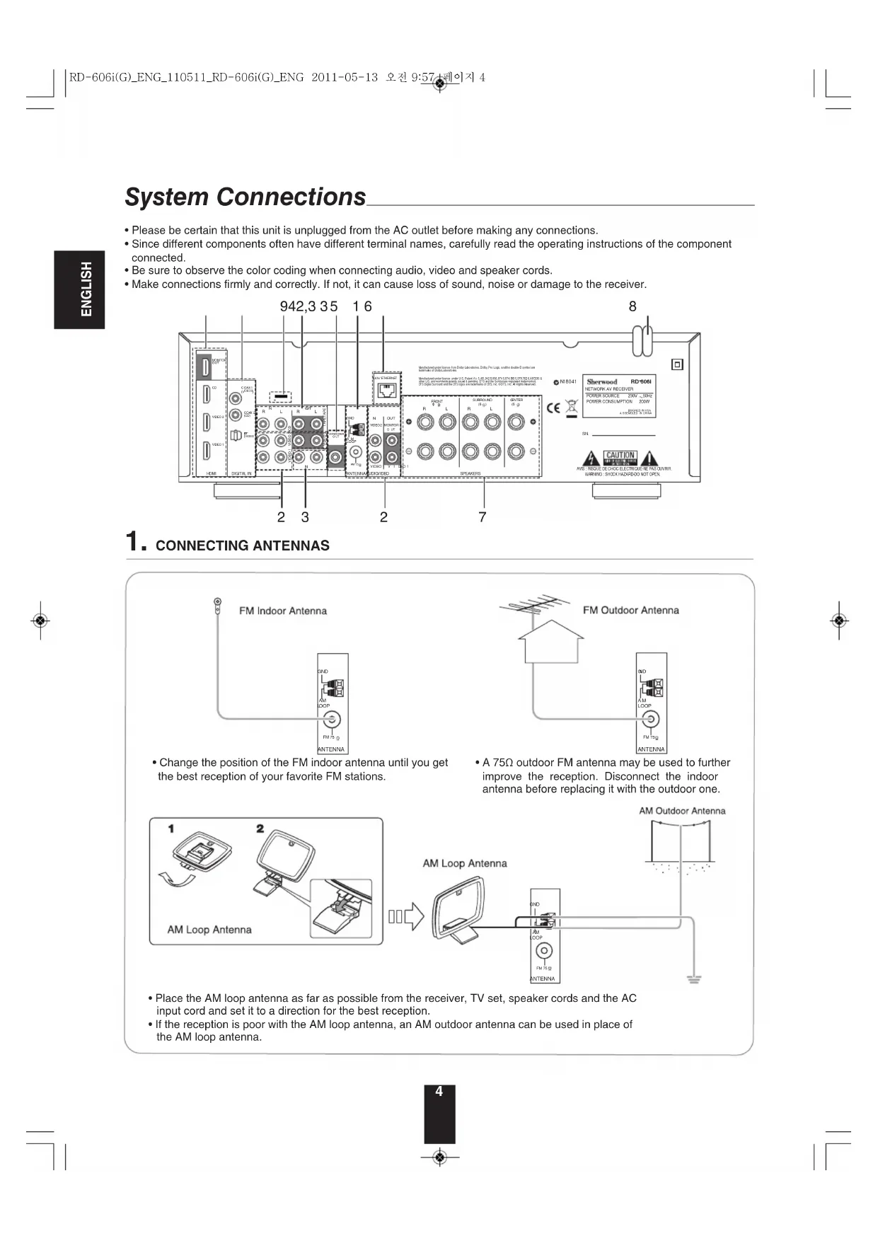 - A 75Ω outdoor FM antenna may be used to further improve the reception. Disconnect the indoor antenna before replacing it with the outdoor one. RD-606i(G)_ENG_110511_RD-606i(G)_ENG 2011-05-13 오전 9:57 페이지 45 ENGLISH HDMI VIDEO 2VIDEO 1 ONITOR OUT