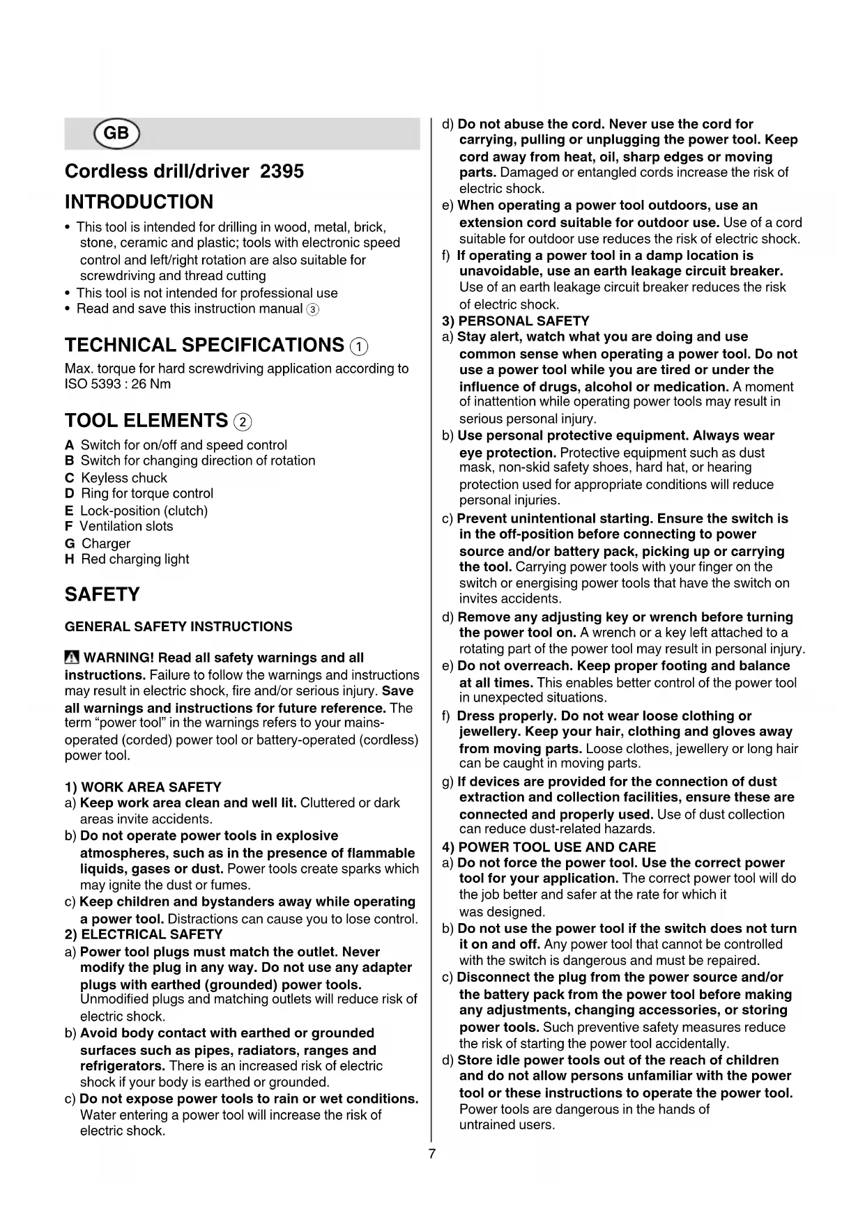 - Read and save this instruction manual 3 TECHNICAL SPECIFICATIONS 1 Max. torque for hard screwdriving application according to ISO 5393 : 26 Nm TOOL ELEMENTS 2 A Switch for on/o and speed control B Switch for changing direction of rotation C Keyless chuck D Ring for torque control E Lock-position (clutch) F Ventilation slots G Charger H Red charging light SAFETY