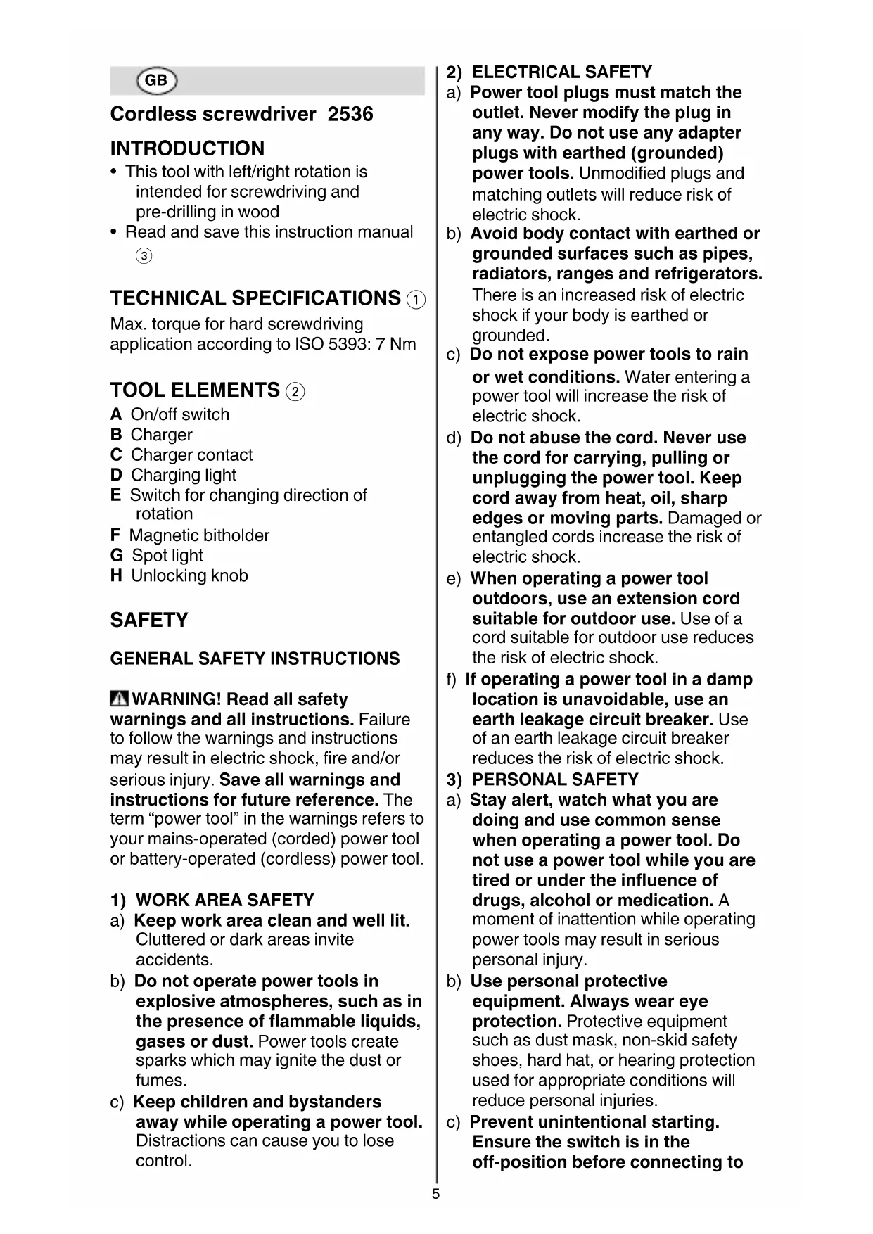 TECHNICAL SPECIFICATIONS 1 Max. torque for hard screwdriving application according to ISO 5393: 7 Nm TOOL ELEMENTS 2 A On/o switch B Charger C Charger contact D Charging light E Switch for changing direction of rotation F Magnetic bitholder G Spot light H Unlocking knob SAFETY