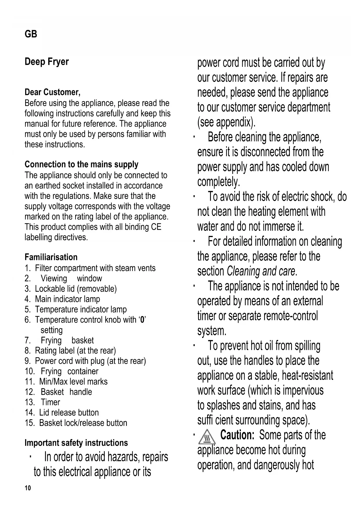 Caution: Some parts of the appliance become hot during operation, and dangerously hot GB11 vapour may be emitted from the lid. ∙ This appliance is intended for domestic or similar applications, such as the - staff kitchens in shops, offi ces and other similar working environments, - agricultural working environments, - by customers in hotels, motels etc. and similar accommodation, - in bed-and breakfast type environments. ∙ Children under 8 must not be permitted to operate this appliance. ∙ Older children of 8 or more, however, may operate the appliance if they are under constant supervision. ∙ The appliance may only be used by persons with reduced physical, sensory or mental capabilities, or lacking experience and knowledge, if they have been given supervision or instruction concerning the use of the appliance and fully understand all dangers and safety precautions involved. ∙ Children must not be permitted to play with the appliance. ∙ Children must not be permitted to carry out any cleaning or maintenance work on the appliance unless they are supervised. ∙ The appliance and its power cord must be kept well away from children under 8 at all times. ∙ Caution: Keep any packaging materials well away from children – such materials are a potential source of danger, e.g. of suffocation. ∙ Do not let the appliance heat up without oil/fat. ∙ Do not leave the deep fryer unattended while in use. ∙ Every time the appliance is used, the main body including the power cord as well as any attachment fi tted should be checked thoroughly for any defects. Should the appliance, for instance, have been dropped onto a hard surface, or if excessive force has been used to pull the power cord, it must no longer be used: even invisible damage may have adverse effects on the operational safety of the appliance. ∙ Do not place the appliance underneath any wall-cupboards or hanging objects, nor directly by a wall or in a corner. ∙ Ensure that no infl ammable materials are stored in the vicinity. ∙ Do not melt solidifi ed fat in an empty appliance: the heating element will not be fully submerged and may therefore overheat, possibly causing the fat to ignite at contact. There is also the possibility that the thermal safety cut-out will switch off the heating element. ∙ Oil/fat that has been used many times before may ignite when overheated. If12 this occurs, remove the plug from the wall socket and place the lid on the appliance in order to smother the fl ames. Never pour water into hot or burning oil or fat. ∙ Never move or carry the appliance when it is hot, i.e. during or immediately after use (because of the danger of tripping). Exercise extreme caution: hot oil or fat can cause severe burns. ∙ Do not touch hot oil/fat with your fi ngers. ∙ Do not insert any plastic cutlery into hot oil or fat. Do not pour hot oil/fat into plastic containers. ∙ Caution: Do not allow the appliance or its power cord to touch hot surfaces or to come into contact with any heat sources. Do not allow the power cord to hang free; the cord must be kept well away from hot parts of the appliance. ∙ Always remove the plug from the wall socket - after use, - in case of any malfunction, and - before cleaning the appliance. ∙ When removing the plug from the wall socket, never pull on the power cord; always grip the plug itself. ∙ Caution: Do not operate the appliance outdoors. ∙ No responsibility will be accepted if damage results from improper use, or if these instructions are not complied with. Before fi rst use Remove any packing materials completely and clean all accessories as described in the section Cleaning and care. To prevent any remaining water from mixing with the oil/fat, ensure that all parts are thoroughly dried. Lid The lid is opened by pressing the lid release button. The lid is spring-loaded and lifts up automatically once the button is pressed. To close the lid, press it down until it locks into place. When the open lid is in a vertical position, it may be removed for cleaning by pulling it gently upwards. Inspection window The inspection window is helpful when monitoring the frying process. To prevent condensation from water vapour, a little oil should be applied to the inside of the window. Frying container Fill level: During the pre-heating phase, the oil level must be between the minimum and maximum level marks, which can be found inside the frying container at the rear. The maximum fi ll capacity of the container is approx. 2.5 litres. Types of oil/fat to be used: Only pure vegetable oil/solidifi ed fat should be used in this deep fryer. It can be heated up to 220 °C and is neutral in taste. Do not mix different kinds of oil/fat. Oil: We recommend the use of oil specifi cally intended for deep-frying, which may be safely heated to high temperatures. Please observe the maximum mark. Solidifi ed fat: Never melt solidifi ed fat in an empty fryer. However, solidifi ed fat may be added straight into the frying container, if it already contains13 liquid fat up to the minimum level mark. The fat should be cut into smaller pieces fi rst and melted in a separate pot, ensuring that it just reaches a liquid state but is not over-heated: this is to avoid the danger of burns when pouring the fat into the frying container afterwards. Please observe the maximum mark. Frying basket The basket is designed to hold the food to be fried. Ensure that the basket is not over-fi lled. The deep fryer can accommodate a maximum of 500 g of chips (French fries). Please refer to Useful hints for deep-frying. With the lid closed, the basket can be lowered into the hot oil from the outside by its handle. To lower the basket, use the lock/ release button integrated in the handle and move the handle down. To raise the basket clear of the oil, move the handle upwards until it locks in a horizontal position. Timer By turning the timer clockwise, the intended operating time can be set. With the timer set 
