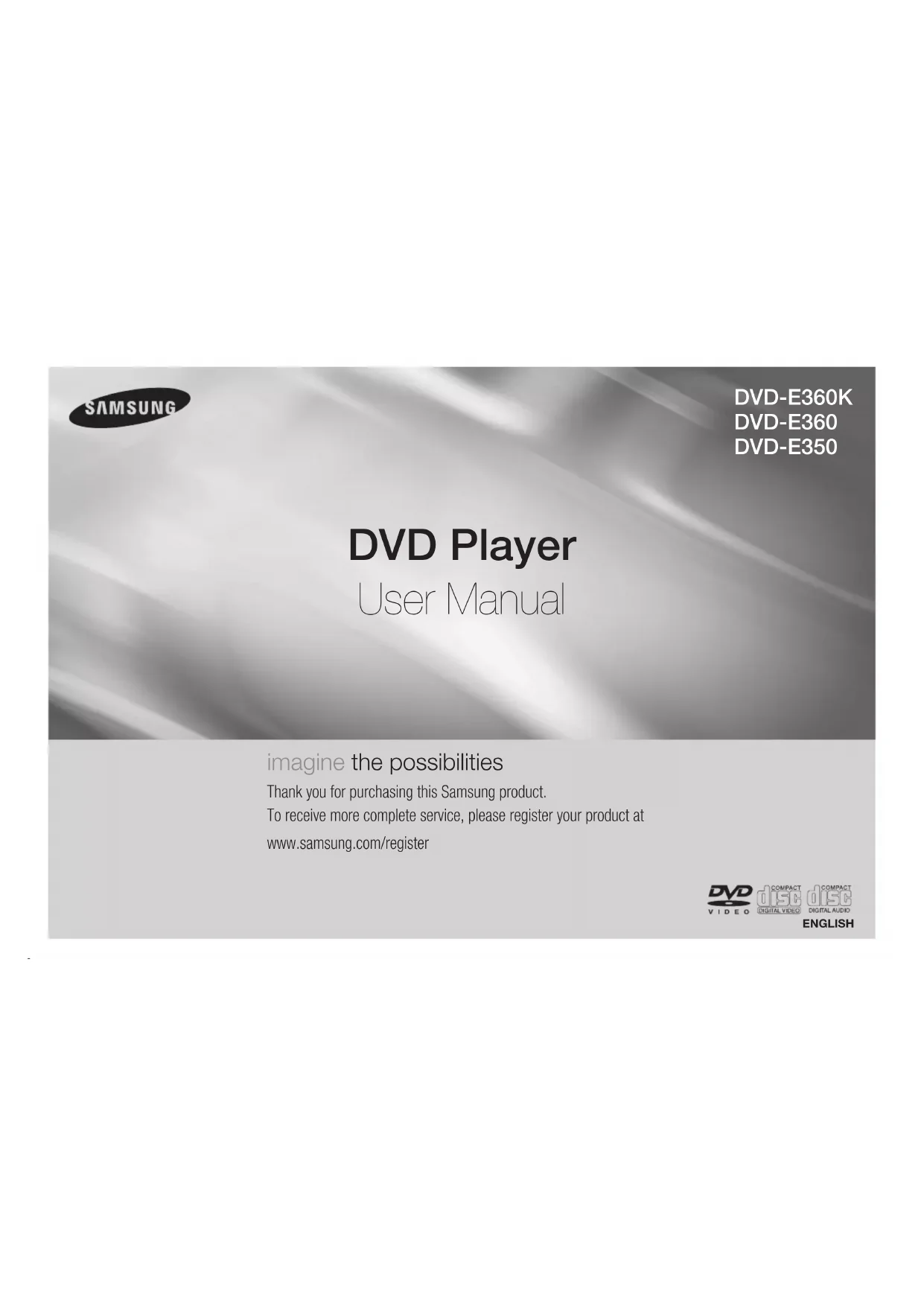 ENGLISH DVD Player User Manual imagine the possibilities Thank you for purchasing this Samsung product. To receive more complete service, please register your product at www.samsung.com/register DVD-E360K DVD-E360 DVD-E3502 Precautions