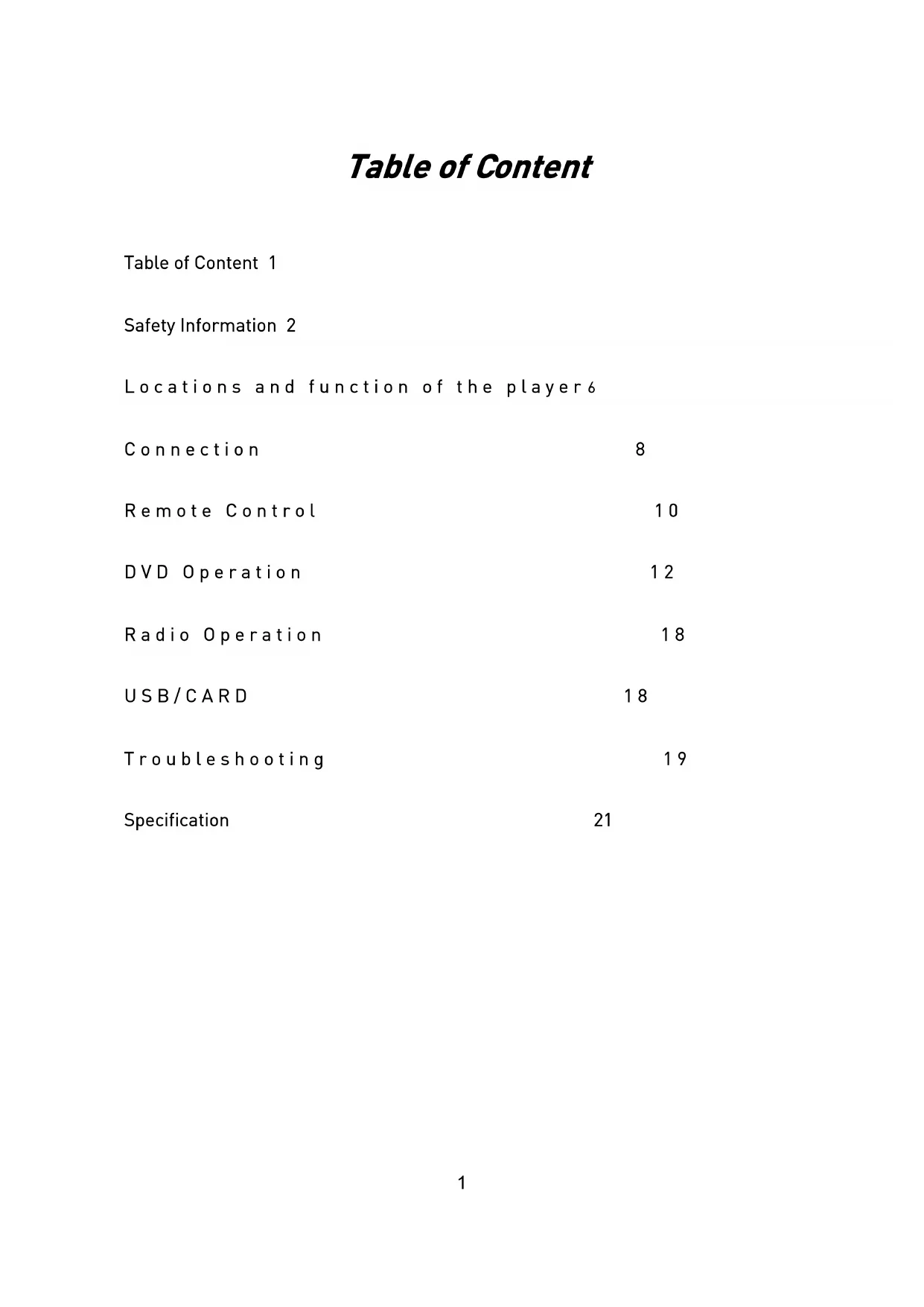 Table of Content 1 Safety Information 2 Locations and function of the player