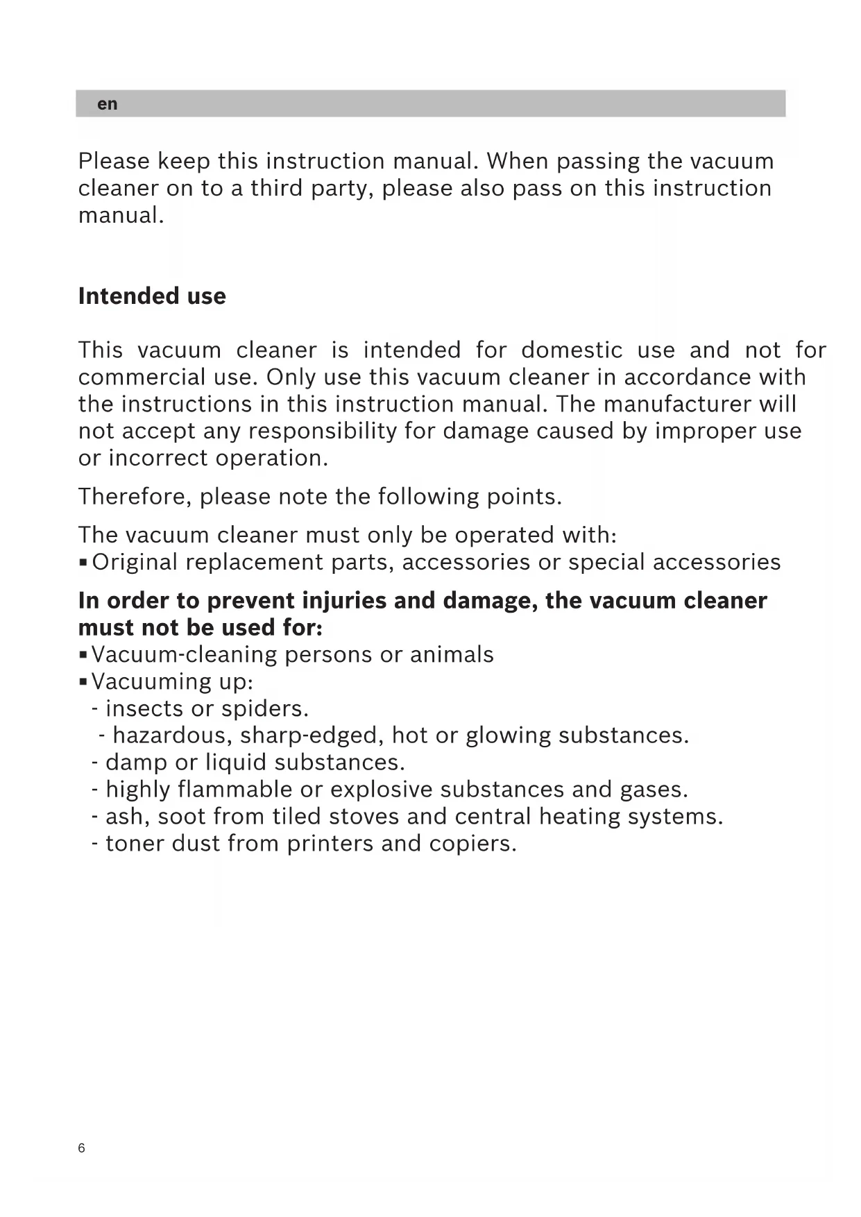 Please keep this instruction manual. When passing the vacuum cleaner on to a third party, please also pass on this instruction manual. Intended use This vacuum cleaner is intended for domestic use and not for commercial use. Only use this vacuum cleaner in accordance with the instructions in this instruction manual. The manufacturer will not accept any responsibility for damage caused by improper use or incorrect operation. Therefore, please note the following points. The vacuum cleaner must only be operated with: Original replacement parts, accessories or special accessories In order to prevent injuries and damage, the vacuum cleaner must not be used for: Vacuum-cleaning persons or animals Vacuuming up: - insects or spiders. - hazardous, sharp-edged, hot or glowing substances. - damp or liquid substances. - highly flammable or explosive substances and gases. - ash, soot from tiled stoves and central heating systems. - toner dust from printers and copiers. ende