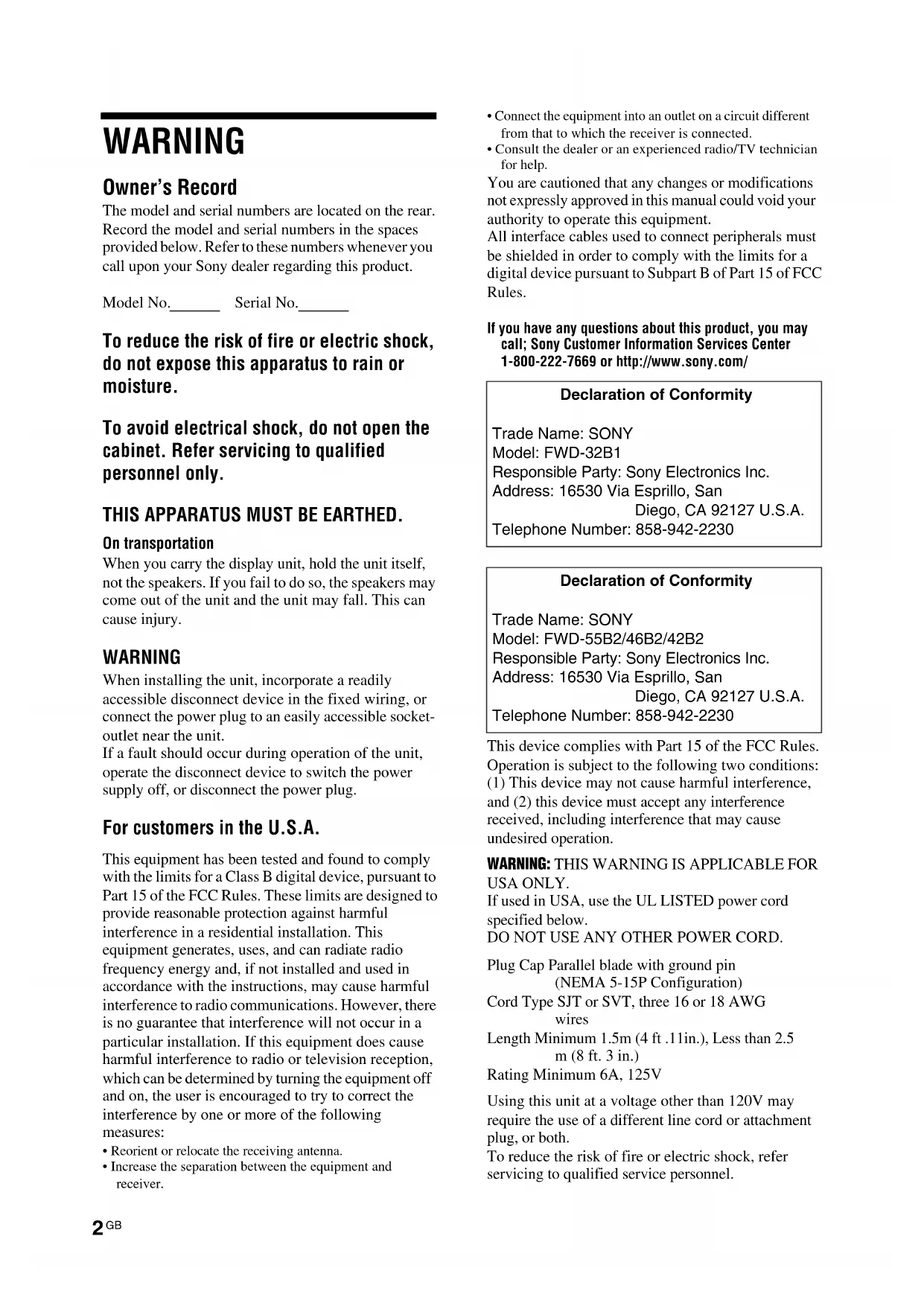 Trade Name: SONY Model: FWD-55B2/46B2/42B2