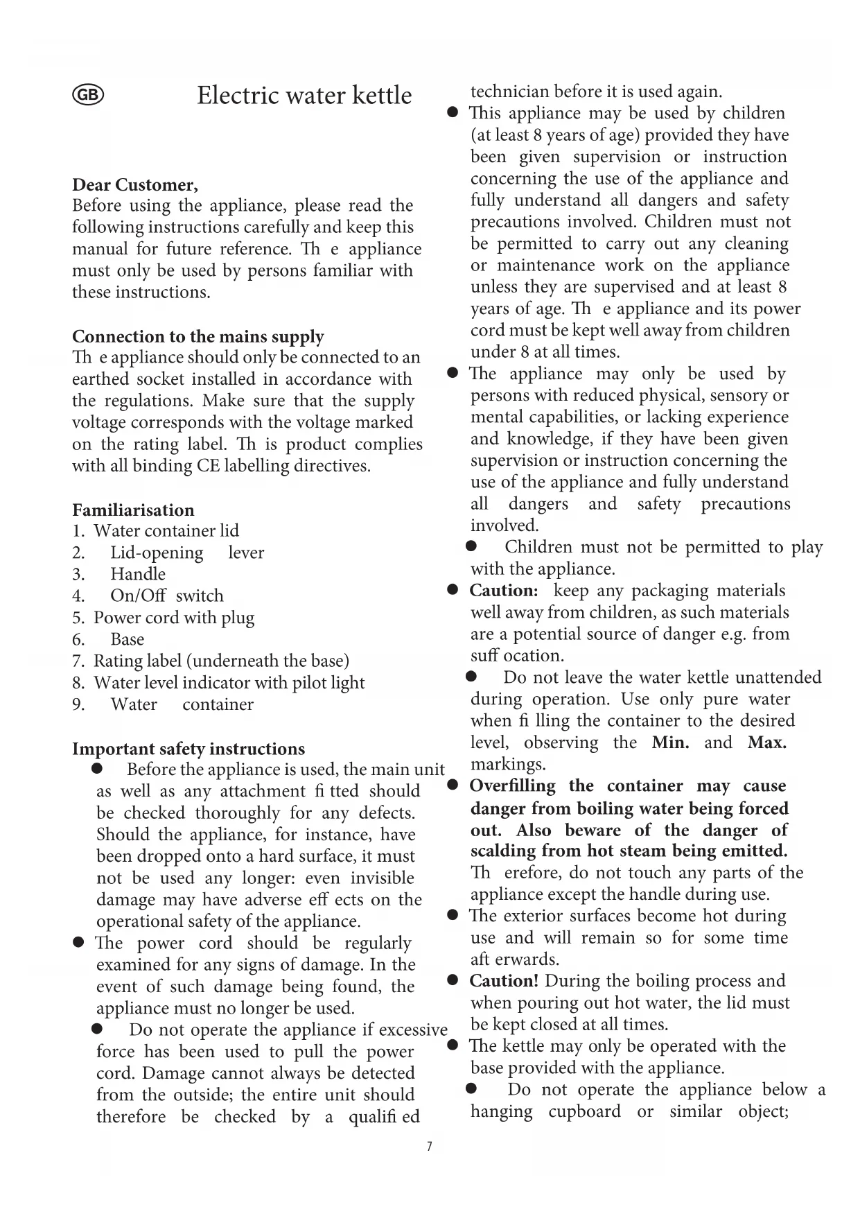 7there is a risk that escaping steam may be trapped underneath. e appliance must be used only on a heat-resistant, level surface. Do not allow the appliance or its power cord to come into contact with open ames or any hot surfaces such as hot- plates. Do not let the power cord hang free, and keep the cord well away from hot parts of the housing. Always remove the plug from the wall socket, - in case of any malfunction, - a er use, - during cleaning. When removing the plug from the wall socket, never pull on the power cord; always grip the plug itself. No responsibility is accepted if damage results from improper use, or if these instructions are not complied with. is appliance is intended for domestic or similar applications, such as - in shops, o ces and other similar working environments, - in agricultural areas, - by customers in hotels, motels etc. and similar establishments, - in bed-and breakfast type environments. In order to comply with safety regulations and to avoid hazards, repairs of electrical appliances must be carried out by quali ed personnel, including the replacement of the power cord. If repairs are needed, please send the appliance to one of our customer service departments. e address can be found in the appendix to this manual. ermal safety cut-out e preset thermal safety cut-out protects the heating element from overheating should the appliance be erroneously switched on without any water, or if the heating element is calci ed. Once the safety cut-out has switched o the kettle, it must be allowed to cool down su ciently, or must be descaled before it is switched on again. Before using for the rst time To clean the kettle, boil and discard the rst lling of water. Boiling water – Remove the water container from its base. – Open the lid and ll the container with water to the desired level, observing the Min. and Max. markings. – Close the lid and place the container back on its base. – Insert the plug into a suitable wall socket and press the On/O switch; the pilot light on the water level indicator comes on. – e boiling process begins. A er reaching the boiling point, the appliance is automatically switched o by the integral steam cut-o device. e pilot light goes out. – To interrupt the boiling process, set the On/O switch to its O position. – To pour hot water, remove the container from its base. – To prevent hot steam from being emitted, ensure that the lid remains closed while pouring out the water. – Remove the plug from the wall outlet a er use. – Do not leave any residual water in the container. Power cord wind-up storage e wind-up power cord storage under the base facilitates limiting the length of the power cord during use and makes it easy to store the appliance. Descaling Depending on the water quality in your area, lime deposits may build up on the heating element. It is advisable to remove any such deposits at regular intervals. Any warranty claim will be null and void if the kettle malfunctions because of insu cient descaling. A mixture of 0.5 litres of water 8to two tablespoons of vinegar essence is suitable. – Pour the descaler in. – Switch the appliance on and let the solution reach boiling point. – Leave it to take e ect for a short period. – To clean the container a er descaling, rinse thoroughly with clean water. Do not pour descalers down enamel- coated sinks. Sieve If necessary, the sieve can be removed from the spout for cleaning. Re-insert the sieve a erwards. General cleaning and care Before cleaning the appliance, ensure it is disconnected from the power supply and has cooled down completely. To avoid the risk of electric shock, do not clean the kettle and the base with water and do not immerse them in water. Do not clean under running water. For cleaning, a slightly damp, lint-free cloth may be used. Do not use abrasives or harsh cleaning solutions, and do not use hard brushes for cleaning. Disposal Do not dispose of old or defective appliances in domestic garbage; this should only be done through public collection points. Guarantee is product is guaranteed against defects in materials and workmanship for a period of two years from the date of purchase. Under this guarantee the manufacturer undertakes to repair or replace any parts found to be defective, providing the product is returned to one of our authorised service centres. is guarantee is only valid if the appliance has been used in accordance with the instructions, and provided that it has not been modi ed, repaired or interfered with by any unauthorised person, or damaged through misuse. is guarantee naturally does not cover wear and tear, nor breakables such as glass and ceramic items, bulbs etc. is guarantee does not a ect your statutory rights, nor any legal rights you may have as a consumer under applicable national legislation governing the purchase of goods. If the product fails to operate and needs to be returned, pack it carefully, enclosing your name and address and the reason for return. If within the guarantee period, please also provide the guarantee card and proof of purchase. 9Bouilloire électrique Chère cliente, Cher client, Avant d’utiliser cet appareil, veuillez lire soigneusement les instructions suivantes et conserver ce manuel pour future référence. L’appareil doit être utilisé exclusivement par des personnes familiarisées avec les présentes instructions. Branchement au secteur La bouilloire devrait être branchée exclusivement sur une prise mise à la terre, installée selon les normes. Assurez-vous que la tension d’alimentation correspond à la tension indiquée sur la plaque signalétique de l’appareil . Ce produit est conforme aux directives obligatoires relatives au marquage CE. Familiarisez-vous avec votre appareil