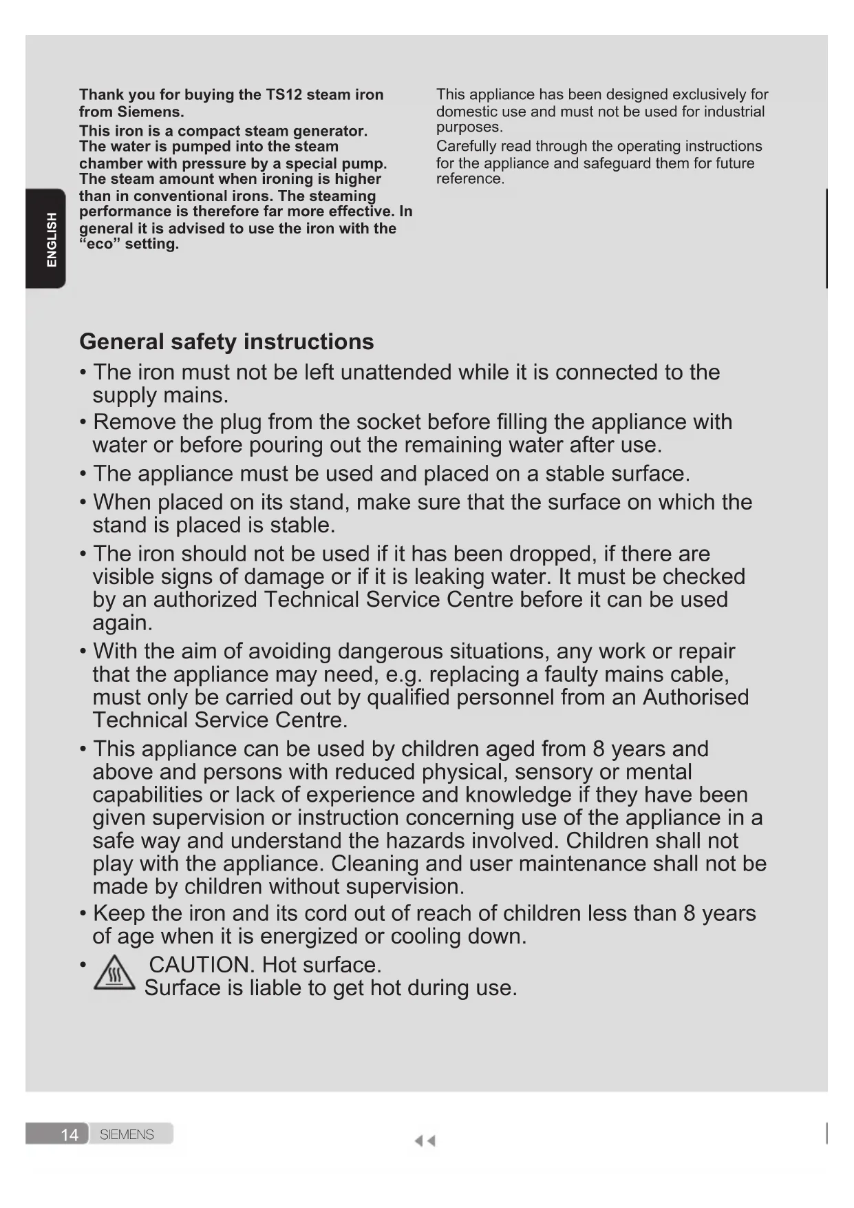 S I E M E N S ENGLISH Thank you for buying the TS12 steam iron