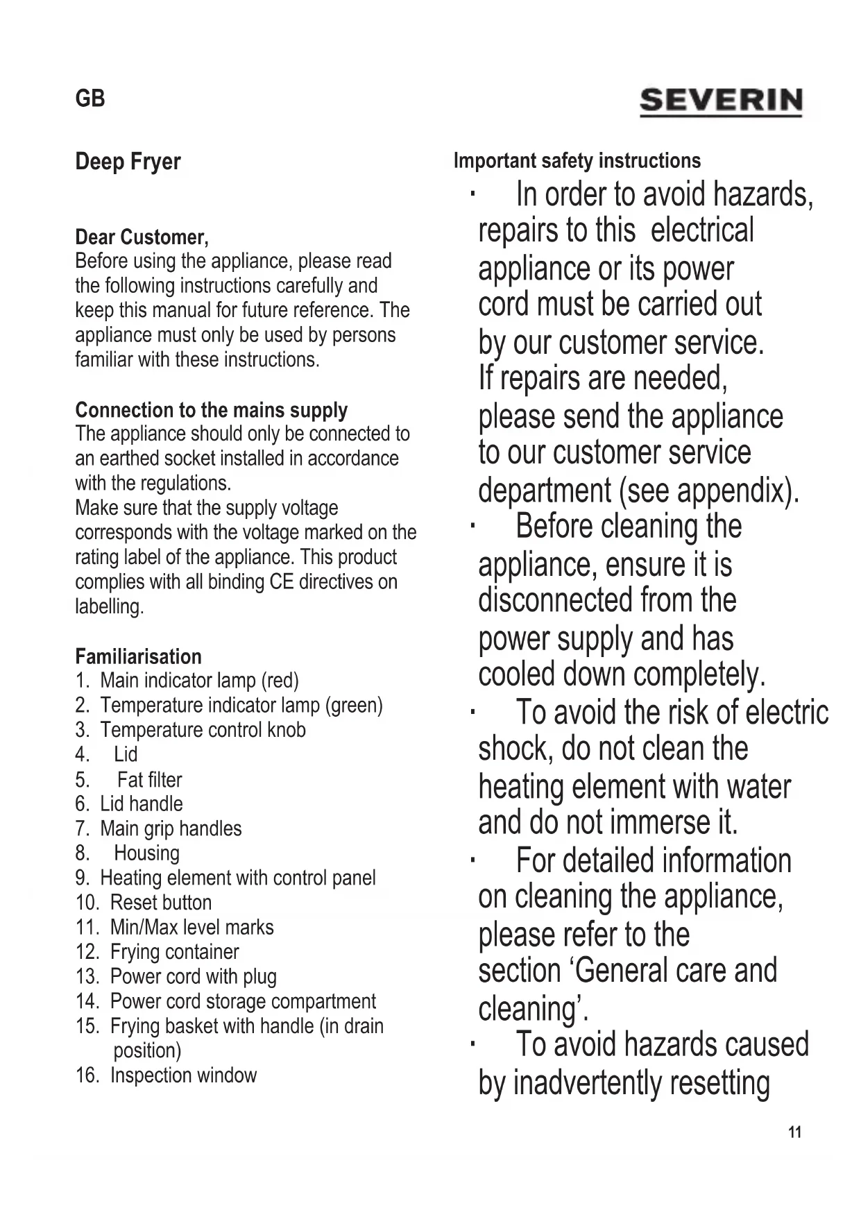Deep Fryer Dear Customer, Before using the appliance, please read the following instructions carefully and keep this manual for future reference. The appliance must only be used by persons familiar with these instructions. Connection to the mains supply The appliance should only be connected to an earthed socket installed in accordance with the regulations. Make sure that the supply voltage corresponds with the voltage marked on the rating label of the appliance. This product complies with all binding CE directives on labelling. Familiarisation