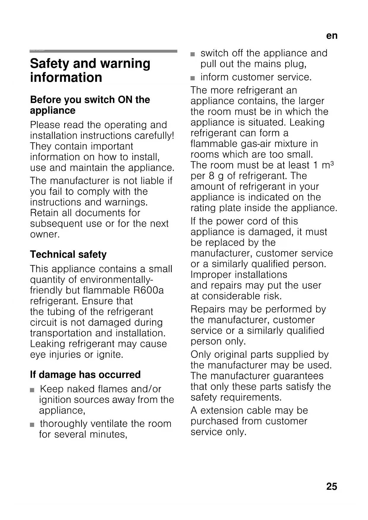 enTable of Contents enInstruction for Use Safety and warning information Before you switch ON the appliance Please read the operating and installation instructions carefully! They contain important information on how to install, use and maintain the appliance. The manufacturer is not liable if you fail to comply with the instructions and warnings. Retain all documents for subsequent use or for the next owner. Technical safety This appliance contains a small quantity of environmentally- friendly but flammable R600a refrigerant. Ensure that the tubing of the refrigerant circuit is not damaged during transportation and installation. Leaking refrigerant may cause eye injuries or ignite. If damage has occurred ■ Keep naked flames and/or ignition sources away from the appliance, ■ thoroughly ventilate the room for several minutes, ■ switch off the appliance and pull out the mains plug, ■ inform customer service. The more refrigerant an appliance contains, the larger the room must be in which the appliance is situated. Leaking refrigerant can form a flammable gas-air mixture in rooms which are too small. The room must be at least 1 m³ per 8 g of refrigerant. The amount of refrigerant in your appliance is indicated on the rating plate inside the appliance. If the power cord of this appliance is damaged, it must be replaced by the manufacturer, customer service or a similarly qualified person. Improper installations and repairs may put the user at considerable risk. Repairs may be performed by the manufacturer, customer service or a similarly qualified person only. Only original parts supplied by the manufacturer may be used. The manufacturer guarantees that only these parts satisfy the safety requirements. A extension cable may be purchased from customer service only.en