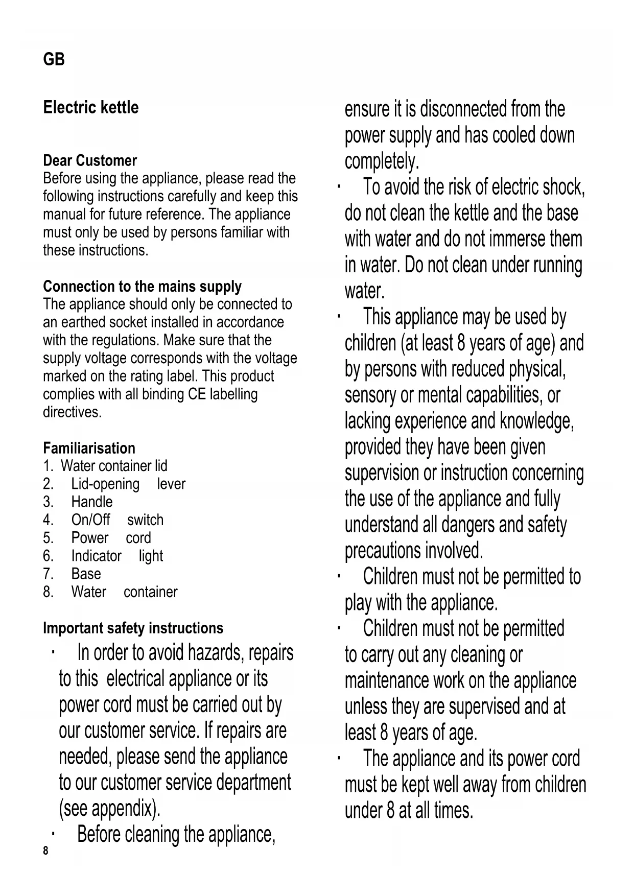 Important safety instructions ∙ In order to avoid hazards, repairs to this electrical appliance or its power cord must be carried out by our customer service. If repairs are needed, please send the appliance to our customer service department (see appendix). ∙ Before cleaning the appliance, ensure it is disconnected from the power supply and has cooled down completely. ∙ To avoid the risk of electric shock, do not clean the kettle and the base with water and do not immerse them in water. Do not clean under running water. ∙ This appliance may be used by children (at least 8 years of age) and by persons with reduced physical, sensory or mental capabilities, or lacking experience and knowledge, provided they have been given supervision or instruction concerning the use of the appliance and fully understand all dangers and safety precautions involved. ∙ Children must not be permitted to play with the appliance. ∙ Children must not be permitted to carry out any cleaning or maintenance work on the appliance unless they are supervised and at least 8 years of age. ∙ The appliance and its power cord must be kept well away from children under 8 at all times. GB9 ∙ This appliance is intended for domestic or similar applications, such