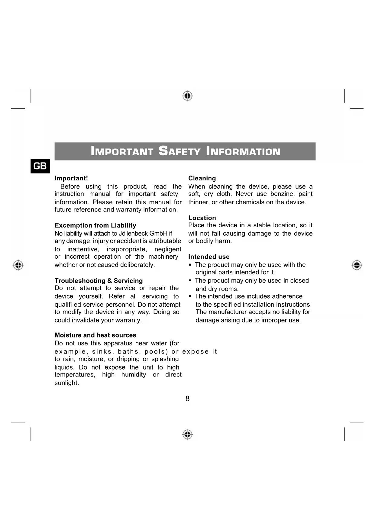 Important! Before using this product, read the instruction manual for important safety information. Please retain this manual for future reference and warranty information. Excemption from Liability No liability will attach to Jöllenbeck GmbH if any damage, injury or accident is attributable to inattentive, inappropriate, negligent or incorrect operation of the machinery whether or not caused deliberately. Troubleshooting & Servicing Do not attempt to service or repair the device yourself. Refer all servicing to qualifi ed service personnel. Do not attempt to modify the device in any way. Doing so could invalidate your warranty. Moisture and heat sources Do not use this apparatus near water (for example, sinks, baths, pools) or expose it to rain, moisture, or dripping or splashing liquids. Do not expose the unit to high temperatures, high humidity or direct sunlight. Cleaning When cleaning the device, please use a soft, dry cloth. Never use benzine, paint thinner, or other chemicals on the device. Location Place the device in a stable location, so it will not fall causing damage to the device or bodily harm. Intended use The product may only be used with the original parts intended for it. The product may only be used in closed and dry rooms. The intended use includes adherence to the specifi ed installation instructions. The manufacturer accepts no liability for damage arising due to improper use.