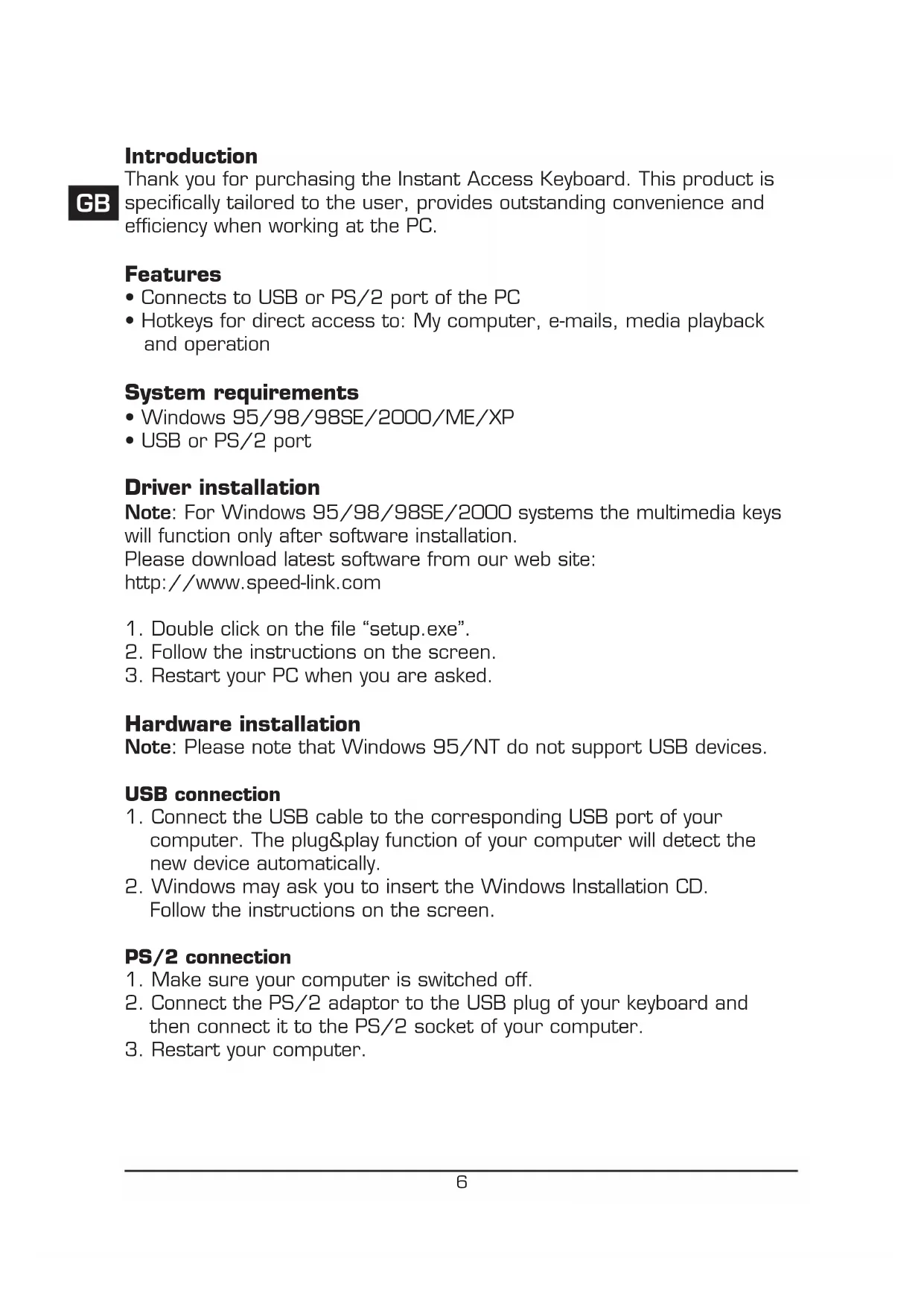 - USB or PS/2 port Driver installation Note: For Windows 95/98/98SE/2000 systems the multimedia keys will function only after software installation. Please download latest software from our web site: http://www.speed-link.com