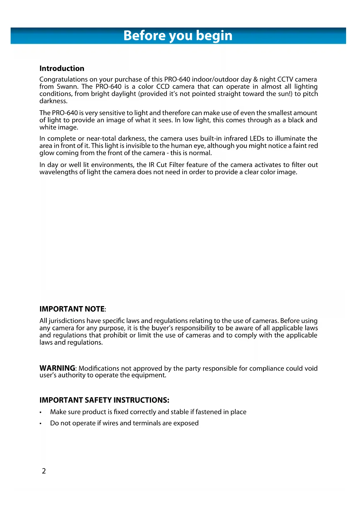 Congratulations on your purchase of this PRO-640 indoor/outdoor day & night CCTV camera from Swann. The PRO-640 is a color CCD camera that can operate in almost all lighting conditions, from bright daylight (provided it's not pointed straight toward the sun!) to pitch darkness.