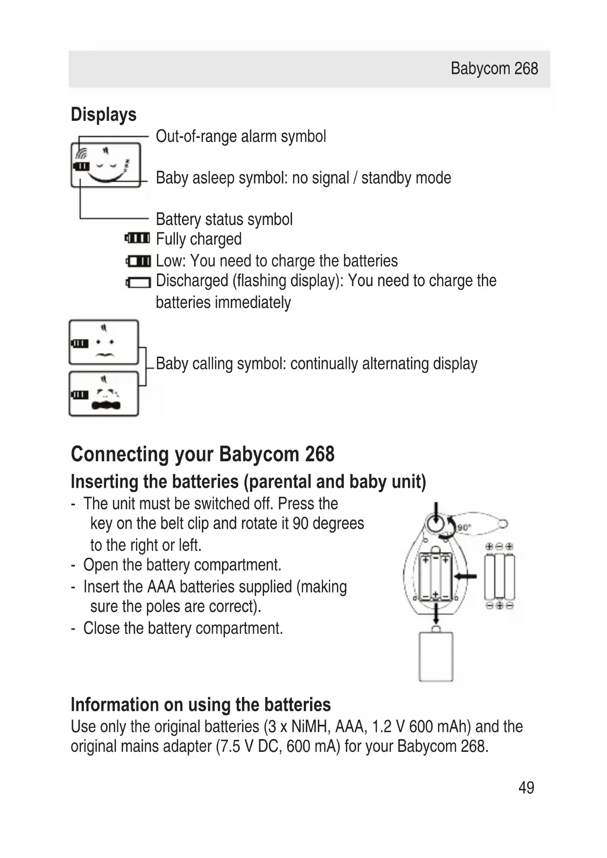 Keys and displays Baby unit keys Parental unit keys 1 LCD display 2 microphone 3 loudspeaker 4 belt clip 5 key block on/off 6 battery compartment 7 ON/OFF / volume adjuster 8 AC/DC socket 9 PAGE key 10 LINK key 1 LCD display 2 microphone 3 loudspeaker 4 belt clip 5 key block on/off 6 battery compartment 7 ON/OFF / volume adjuster 8 AC/DC socket 9 TALK key 10 PAGE key 11 LINK key Babycom 268 EN_080909:Babycom 143 10.09.09 11:32 Seite 48Displays Out-of-range alarm symbol Baby asleep symbol: no signal / standby mode Battery status symbol Fully charged Low: You need to charge the batteries Discharged (flashing display): You need to charge the batteries immediately Baby calling symbol: continually alternating display Connecting your Babycom 268 Inserting the batteries (parental and baby unit) - The unit must be switched off. Press the key on the belt clip and rotate it 90 degrees to the right or left. - Open the battery compartment. - Insert the AAA batteries supplied (making sure the poles are correct). - Close the battery compartment. Information on using the batteries Use only the original batteries (3 x NiMH, AAA, 1.2 V 600 mAh) and the original mains adapter (7.5 V DC, 600 mA) for your Babycom 268. Babycom 268