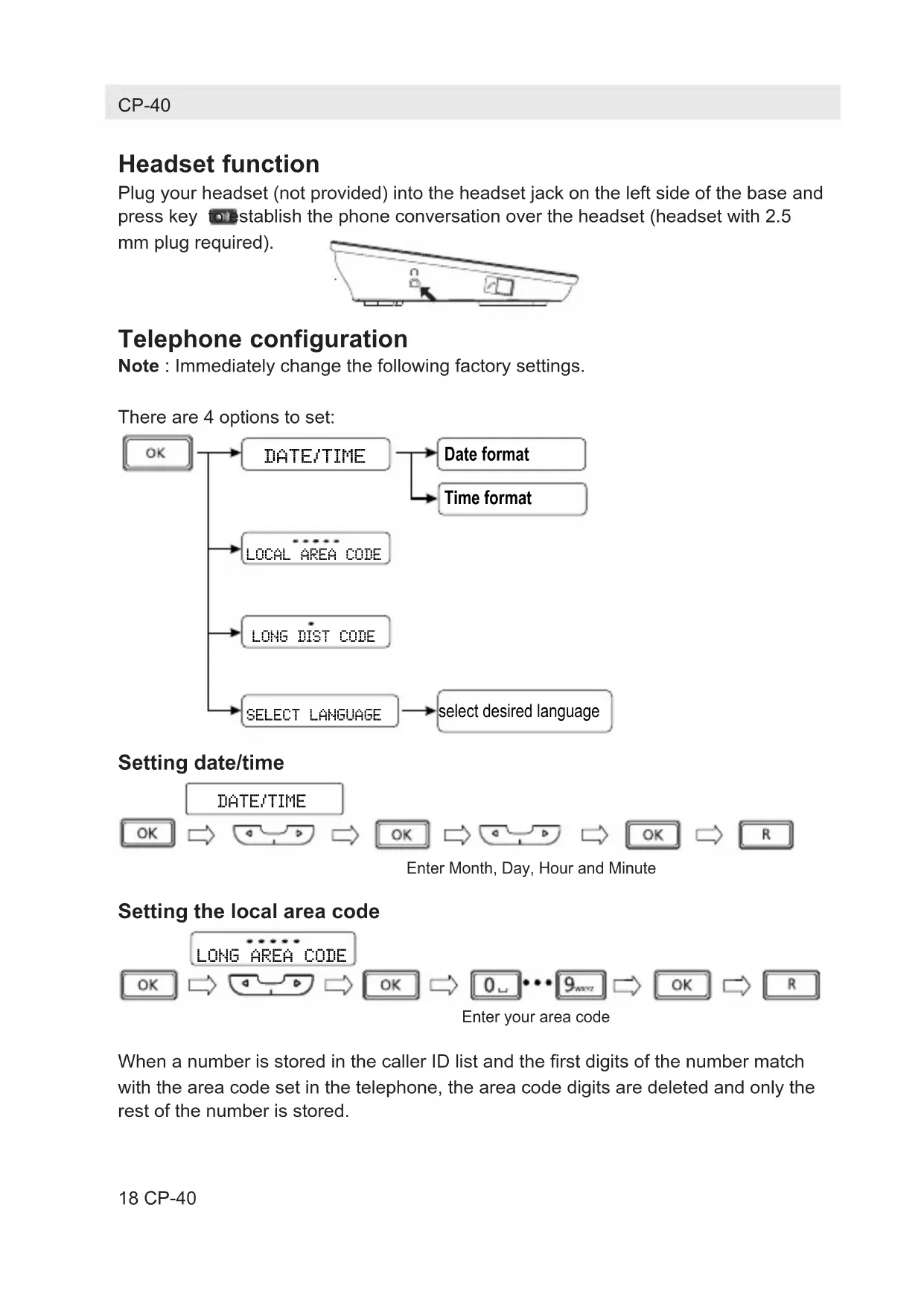 Key 0 / Insert a space essage indic atorHeadset function Plug your headset (not provided) into the headset jack on the left side of the base andpress key to establish the phone conversation over the headset (headset with 2.5mm plug required). Telephone configuration Note : Immediately change the following factory settings.There are 4 options to set: Setting date/time Setting the local area code When a number is stored in the caller ID list and the first digits of the number matchwith the area code set in the telephone, the area code digits are deleted and only therest of the number is stored. Date format DATE/TIME