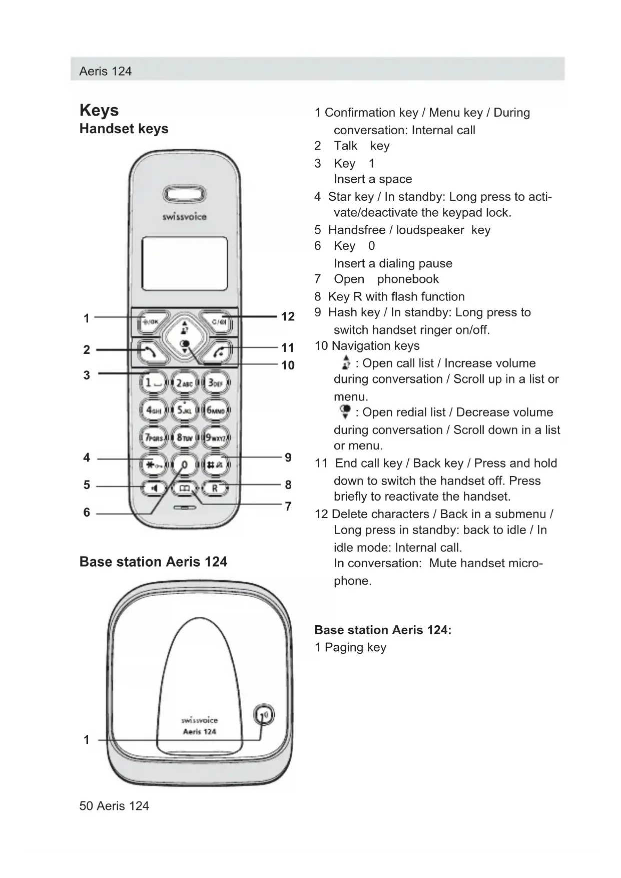La conformità con la direttiva sopra menzionata è confermata dal marchio CE sull’apparecchio. Aeris 124 Aeris 124 47Welcome to Swissvoice The Aeris 124 is a cordless telephone designed for connection to an analog telephone network. International DECT (GAP)-standard digital technology offers excellent voice quality. You can register up to 5 handsets to your base and make internal calls free of charge. Please read these operating instructions carefully to familiarise yourself with and take full advantage of the benefits of your new Aeris 124. Aeris 124 48 Aeris 124Contents Keys 50 Display symbols 51 Battery advice 52 Telephoning 54 Accepting a call 54 Turn off the ringer 54 Set speaker/loudspeaker volume 54 Switch handset off 54 Redial 55 Mute the handset microphone 55 Keypad lock 55 Paging – Locate mislaid handsets 55 Phonebook 55 Call list 56 Voicebox (network answering machine) 57 Extending the Aeris 124 57 Telephoning with several call partners 58 Handset settings 59 Base station settings 59 Reset 59