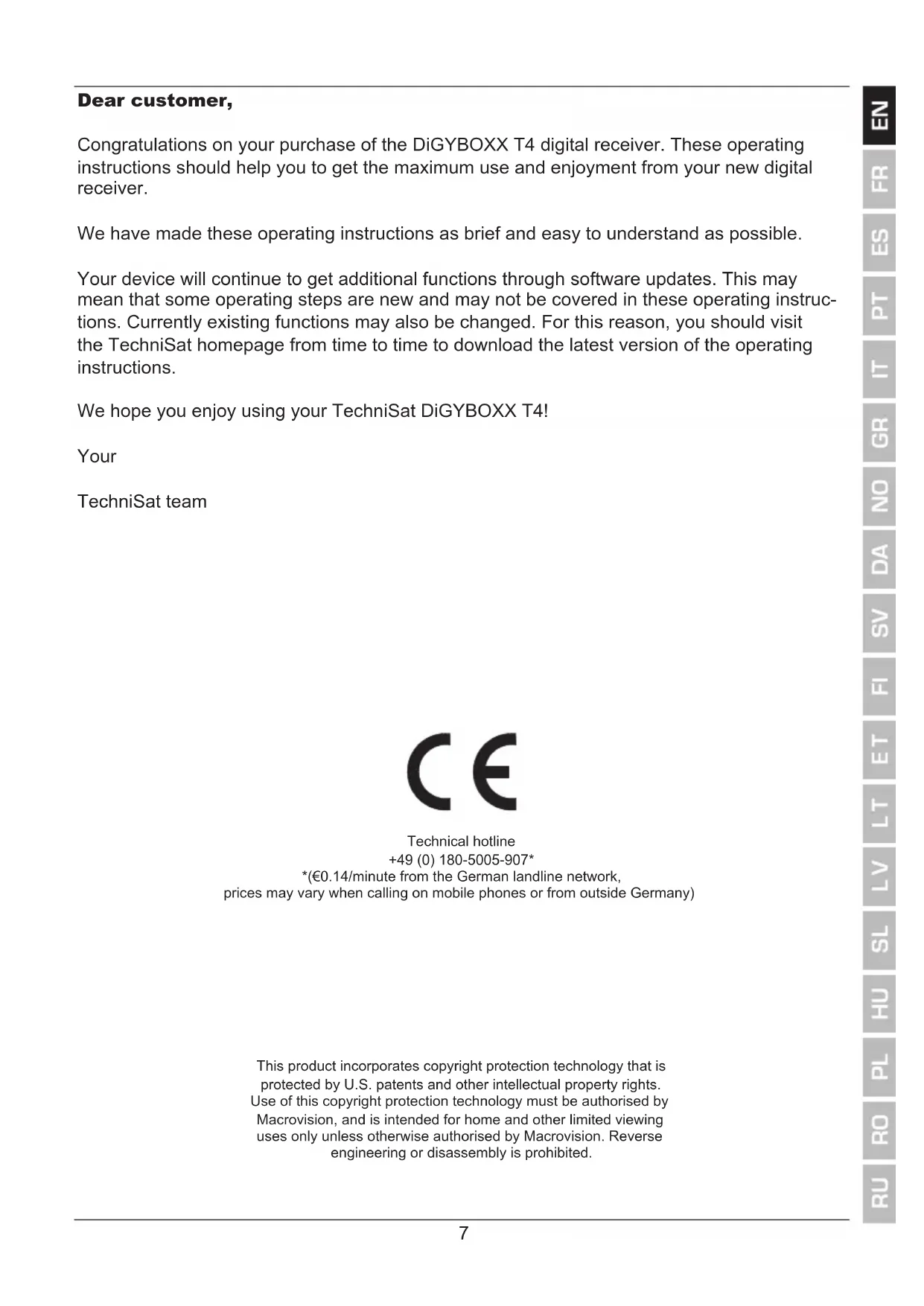 SCART socket VCR DC input HDMI output Antenna output USB port Audio outputs: analogue Audio output: digital (electrical) Programme selection up/down On/Standby LED display7 Dear customer, Congratulations on your purchase of the DiGYBOXX T4 digital receiver. These operating instructions should help you to get the maximum use and enjoyment from your new digital receiver. We have made these operating instructions as brief and easy to understand as possible. Your device will continue to get additional functions through software updates. This may mean that some operating steps are new and may not be covered in these operating instruc- tions. Currently existing functions may also be changed. For this reason, you should visit the TechniSat homepage from time to time to download the latest version of the operating instructions. We hope you enjoy using your TechniSat DiGYBOXX T4! Your TechniSat team Technical hotline +49 (0) 180-5005-907* *(€0.14/minute from the German landline network, prices may vary when calling on mobile phones or from outside Germany) This product incorporates copyright protection technology that is protected by U.S. patents and other intellectual property rights. Use of this copyright protection technology must be authorised by Macrovision, and is intended for home and other limited viewing uses only unless otherwise authorised by Macrovision. Reverse engineering or disassembly is prohibited.3 Please Read Before Operation > Before using the device, first check to make sure that all of the parts are included. The scope of delivery includes: 1 digital receiver, 1 mains adapter, 1 remote control, 2 batteries (1.5 V AAA battery), 1 operating instructions on CD-ROM, 1 quick reference guide, 1 warranty card. > Place the supplied batteries in the battery compartment of the remote control (make sure that the polarity is correct).