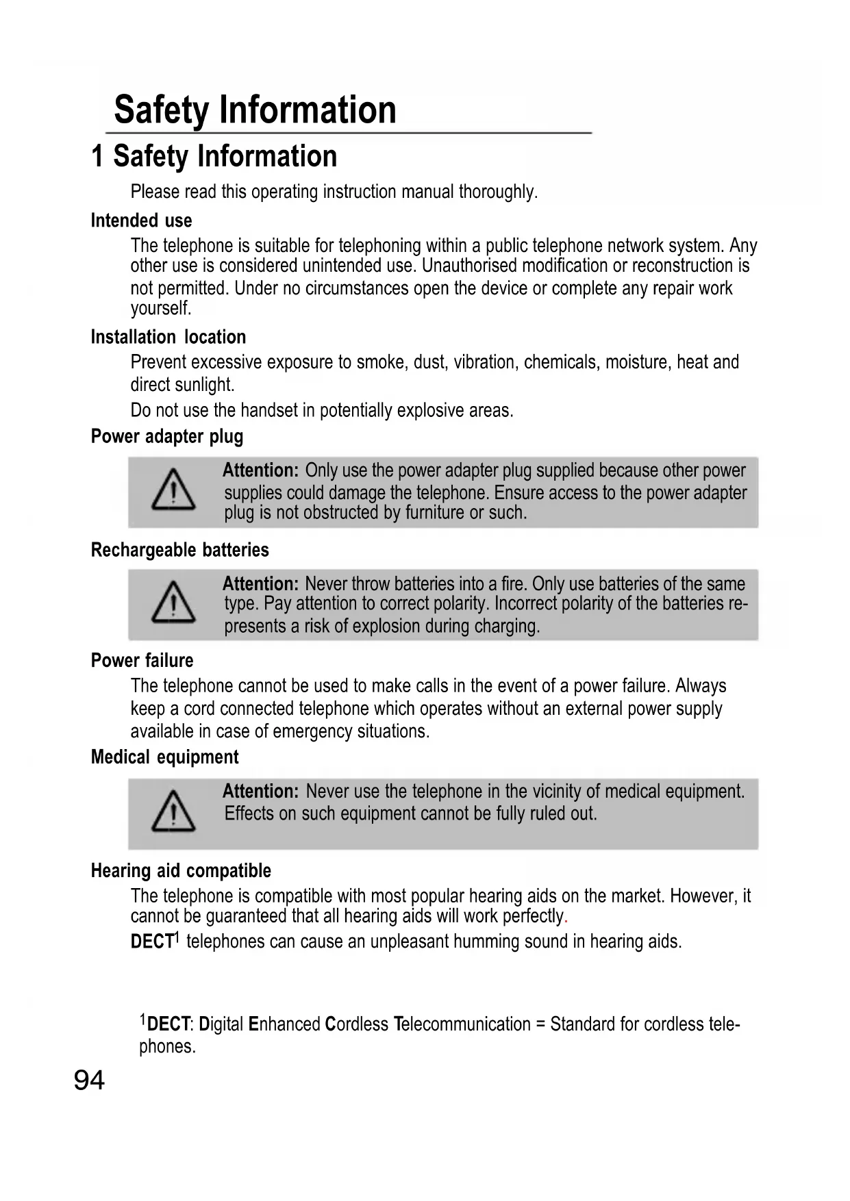 1 Safety Information Please read this operating instruction manual thoroughly. Intended use The telephone is suitable for telephoning within a public telephone network system. Any other use is considered unintended use. Unauthorised modification or reconstruction is not permitted. Under no circumstances open the device or complete any repair work yourself. Installation location Prevent excessive exposure to smoke, dust, vibration, chemicals, moisture, heat and direct sunlight. Do not use the handset in potentially explosive areas. Power adapter plug Attention: Only use the power adapter plug supplied because other power supplies could damage the telephone. Ensure access to the power adapter plug is not obstructed by furniture or such. Rechargeable batteries Attention: Never throw batteries into a fire. Only use batteries of the same type. Pay attention to correct polarity. Incorrect polarity of the batteries re- presents a risk of explosion during charging. Power failure The telephone cannot be used to make calls in the event of a power failure. Always keep a cord connected telephone which operates without an external power supply available in case of emergency situations. Medical equipment Attention: Never use the telephone in the vicinity of medical equipment. Effects on such equipment cannot be fully ruled out. Hearing aid compatible The telephone is compatible with most popular hearing aids on the market. However, it cannot be guaranteed that all hearing aids will work perfectly. DECT