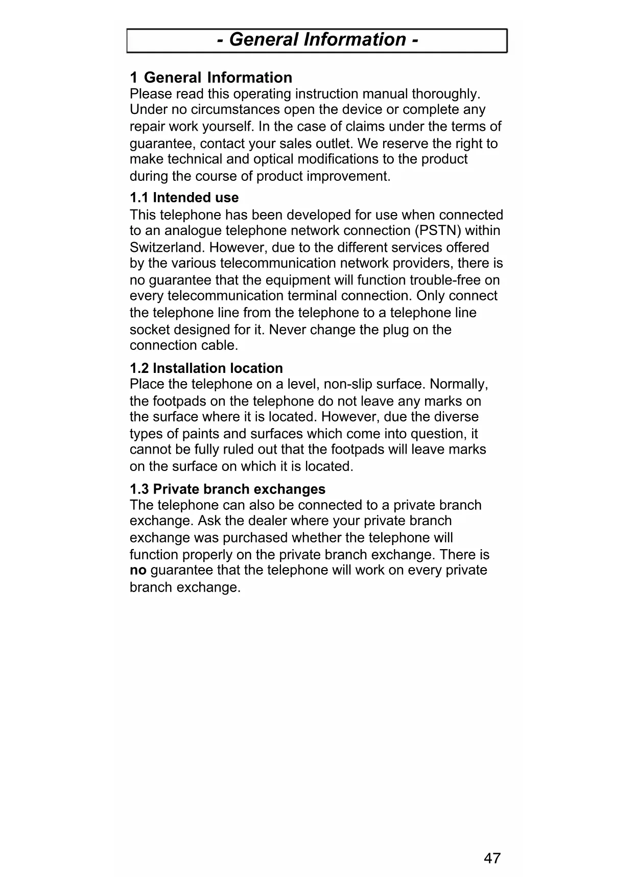 The telephone can also be connected to a private branch exchange. Ask the dealer where your private branch exchange was purchased whether the telephone will function properly on the private branch exchange. There is no guarantee that the telephone will work on every private branch exchange.− General Information −