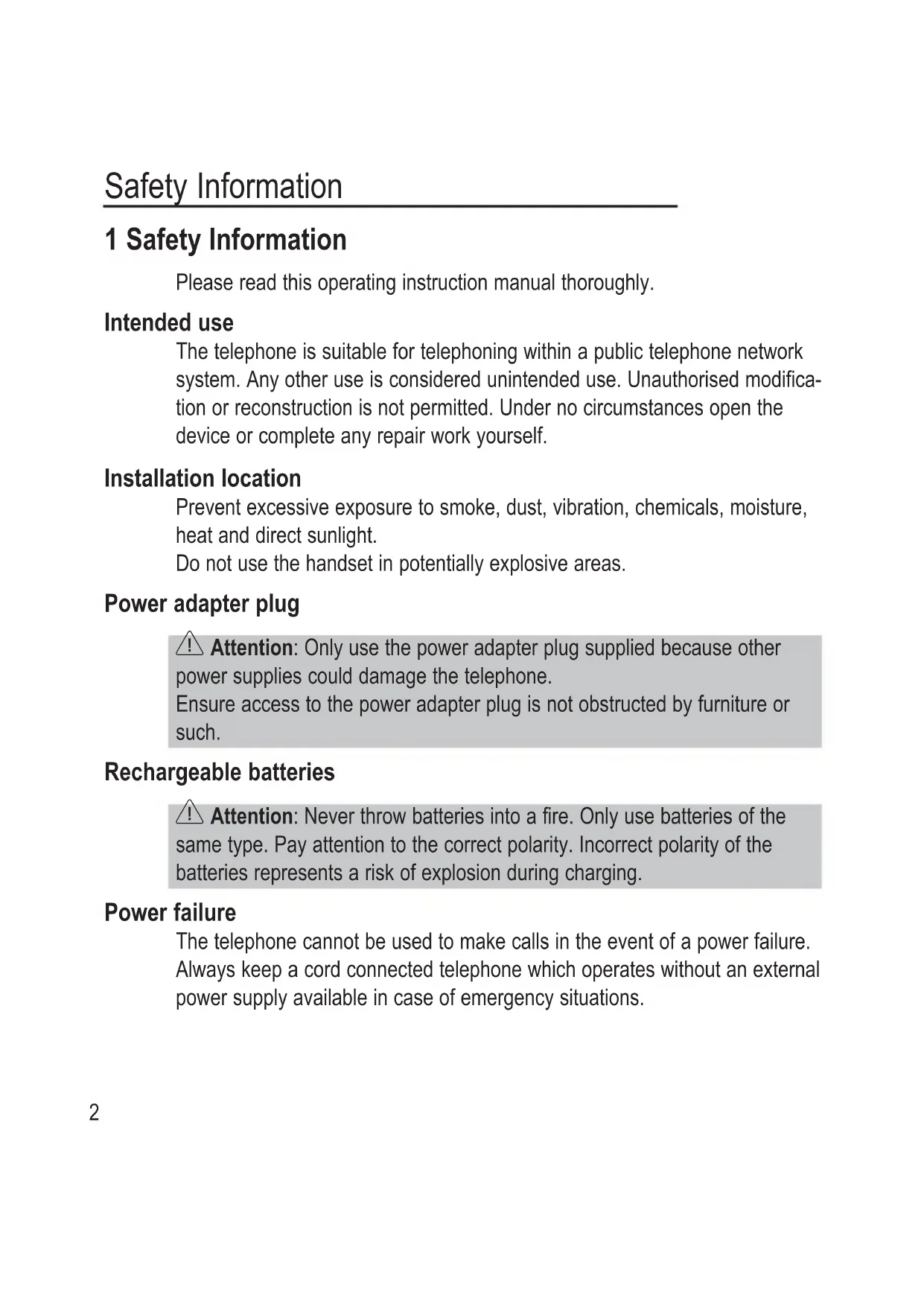 The telephone is suitable for telephoning within a public telephone network system. Any other use is considered unintended use. Unauthorised modification or reconstruction is not permitted. Under no circumstances open the device or complete any repair work yourself.