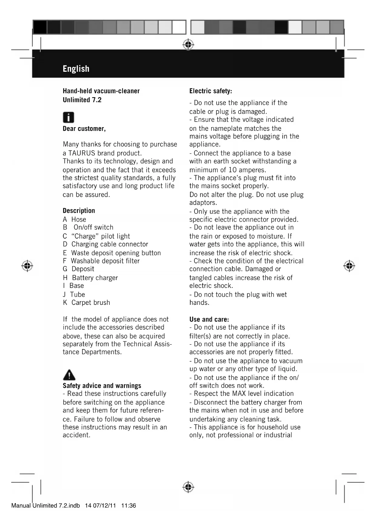 Unlimited 7.2 - Aspirateur TAURUS - Free user manual and instructions