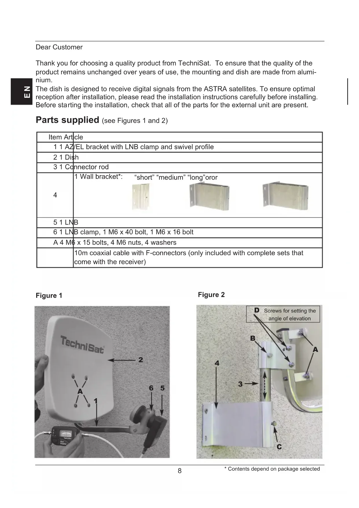 D Screws for setting the angle of elevation Figure 1 Figure 2 Item Article 1 1 AZ/EL bracket with LNB clamp and swivel profile 2 1 Dish 3 1 Connector rod