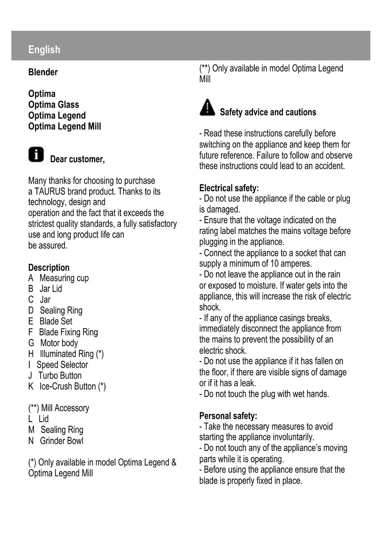 Download the instructions for your Blender in PDF format for free! Find your manual Optima Legend - TAURUS and take your electronic device back in hand. On this page are published all the documents necessary for the use of your device. Optima Legend by TAURUS.