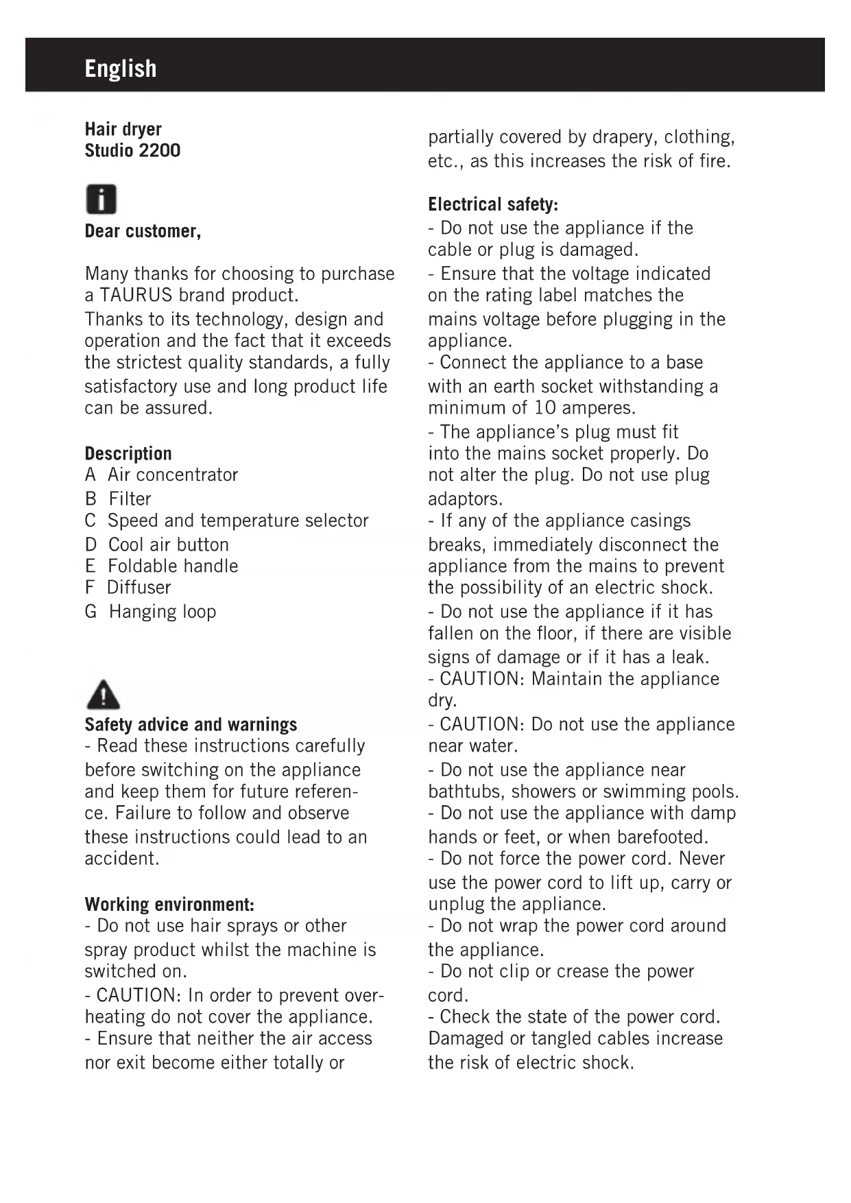Download the instructions for your Sèche-cheveux in PDF format for free! Find your manual Studio 2200 - TAURUS and take your electronic device back in hand. On this page are published all the documents necessary for the use of your device. Studio 2200 by TAURUS.