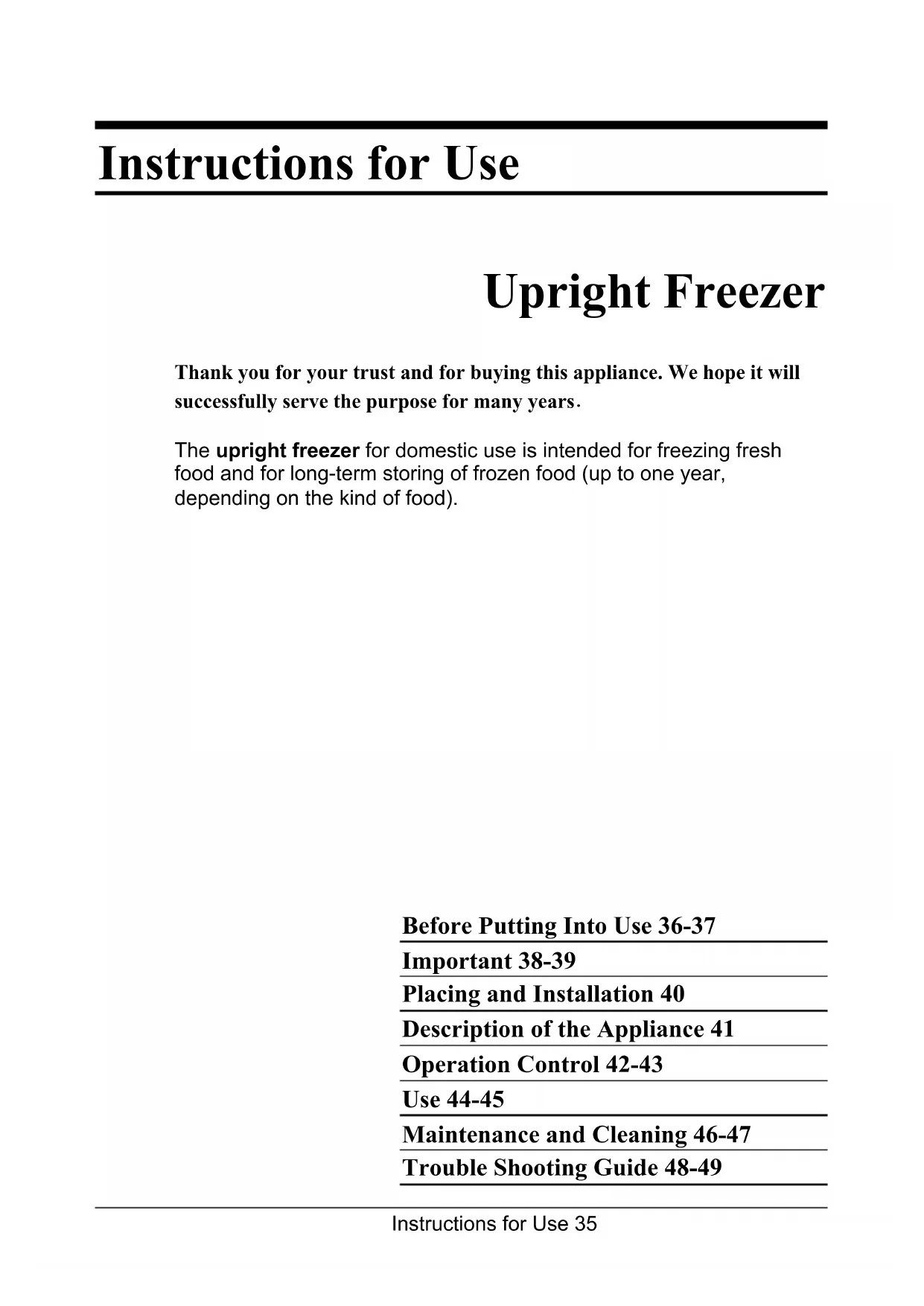 The upright freezer for domestic use is intended for freezing fresh food and for long-term storing of frozen food (up to one year, depending on the kind of food). Before Putting Into Use 36-37 Important 38-39 Placing and Installation 40 Description of the Appliance 41 Operation Control 42-43 Use 44-45 Maintenance and Cleaning 46-47 Trouble Shooting Guide 48-49Instructions for Use36 Before Putting Into Use