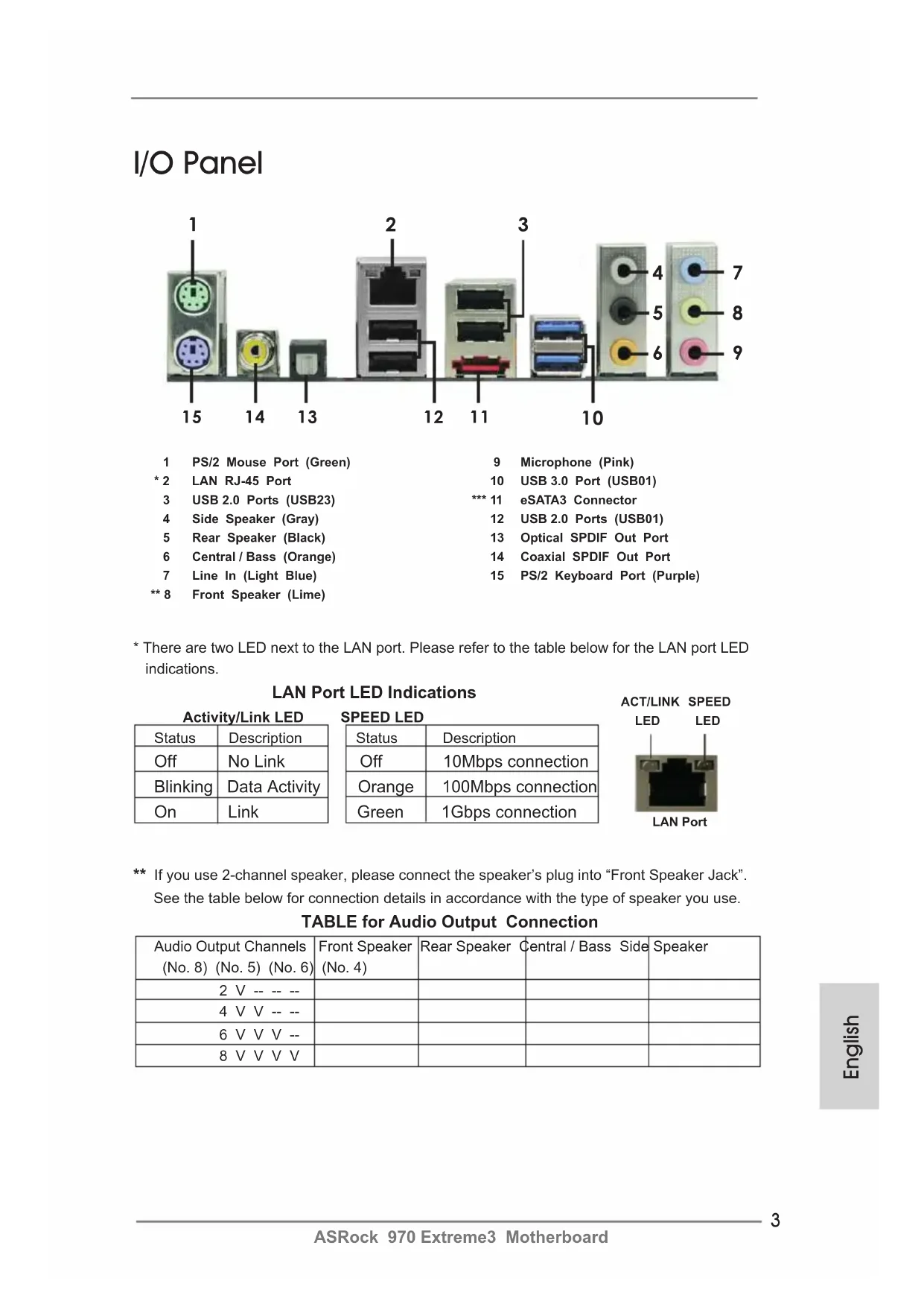 ** If you use 2-channel speaker, please connect the speaker’s plug into “Front Speaker Jack”. See the table below for connection details in accordance with the type of speaker you use.TABLE for Audio Output ConnectionAudio Output Channels Front Speaker Rear Speaker Central / Bass Side Speaker (No. 8) (No. 5) (No. 6) (No. 4)2 V -- -- --4 V V -- --6 V V V --8 V V V VLAN PortACT/LINK LEDSPEED LED* There are two LED next to the LAN port. Please refer to the table below for the LAN port LED indications. LAN Port LED Indications Activity/Link LED SPEED LED Status Description Status Description Off No Link Off 10Mbps connectionBlinking Data Activity Orange 100Mbps connectionOn Link Green 1Gbps connection 1 PS/2 Mouse Port (Green) 9 Microphone (Pink)