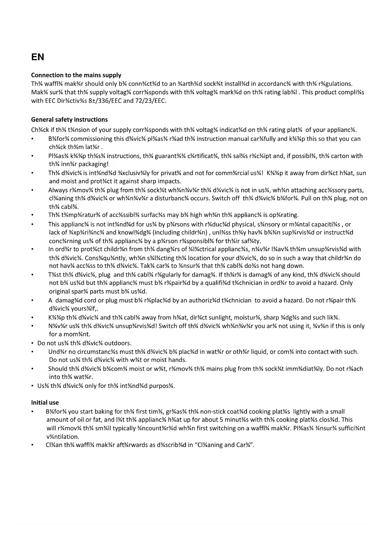 Th ^3/4 waffl ^3/4 mak ^3/4 r should only b ^3/4 conn ^3/4 ct ^3/4 d to an ^3/4 arth ^3/4 d sock ^3/4 t install ^3/4 d in accordanc ^3/4 with th ^3/4 r ^3/4 gulations. Mak ^3/4 sur ^3/4 that th ^3/4 supply voltag ^3/4 corr ^3/4 sponds with th ^3/4 voltag ^3/4 mark ^3/4 d on th ^3/4 rating lab ^3/4 . This product compli ^3/4 s with EEC Dir ^3/4 activ ^3/4 s 8±/336/EEC and 72/23/EEC.