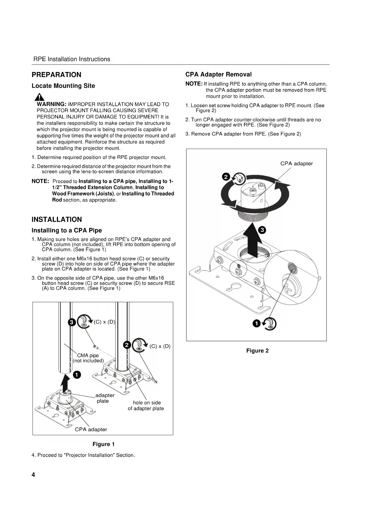 screen using the lens-to-screen distance information. NOTE: Proceed to Installing to a CPA pipe, Installing to 1- 1/2" Threaded Extension Column, Installing to Wood Framework (Joists), or Installing to Threaded Rod section, as appropriate. INSTALLATION Installing to a CPA Pipe