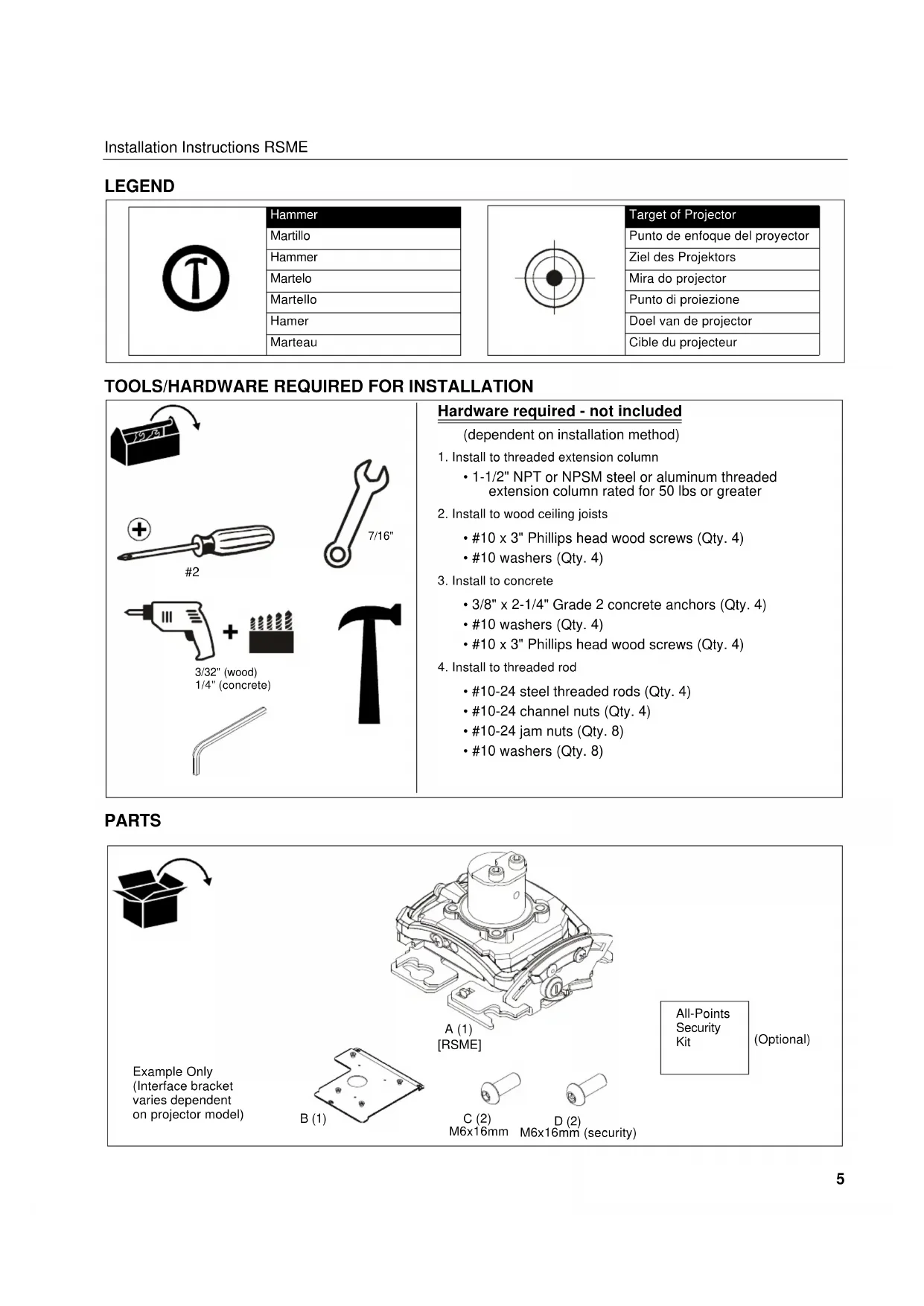 on projector model) Example Only (Interface bracket varies dependent A (1) B (1) All-Points Security Kit (Optional) [RSME] C (2) M6x16mm D (2) M6x16mm (security)RSME Installation Instructions