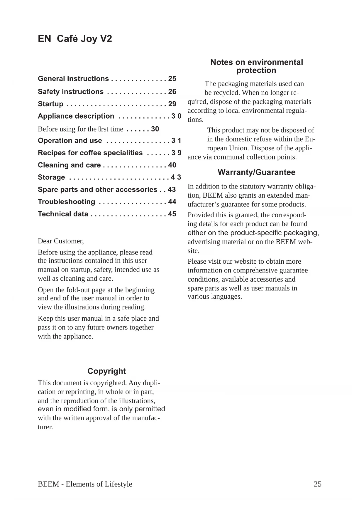 - Nummerierung gemäß Gerätebeschreibung22 Café Joy V2 DE BEEM - Elements of Lifestyle Störungsbehebung Die nachfolgende Tabelle hilft bei der Lokalisierung und Behebung kleinerer Störungen: Fehler Mögliche Ursache Behebung Keine Anzeige auf dem Display Netzstecker nicht eingesteckt. Netzstecker einstecken. Keine Netzspannung vorhan- den. Sicherung/Steckdose kontrollieren. Display defekt. Kundendienst benach- richtigen. Der Sicherungsautomat in der Elektroverteilung springt heraus. Zu viele Geräte am selben Stromkreis angeschlossen. Anzahl der Geräte im Stromkreis reduzieren. Kein Fehler feststellbar. Kundendienst benach- richtigen. Der Filterhalter lässt sich nicht einwandfrei in die Brühposition schieben. Der Permanentlter sitzt nicht richtig im Filterhalter. Permanentlter korrekt einsetzen, siehe Kapitel Permanentlter einset- zen (S. 11). Der Kaffee läuft sehr lang- sam in die Glaskanne. Tropfstopp verstopft. Tropfstopp reinigen. Gerät verkalkt. Gerät entkalken. Trotz Pumpgeräuschen kommt kein Wasser aus dem Gerät. Kein Wasser im Tank. Wasser einfüllen. Der Kaffee läuft auf die Warmhalteplatte. Glaskanne nicht richtig plat- ziert. Glaskanne mittig unter den Filterhalter stellen. Wasser läuft aus dem Gerät. Zu viel Wasser im Wasserbe- hälter. Wasserbehälter nicht überfüllen. Tropfschale voll. Tropfschale ausleeren. Kein Fehler feststellbar. Kundendienst benach- richtigen. Wasser läuft aus dem Siebträger. Der Rand des Siebträgers ist mit Kaffeeresten verschmutzt. Siebträger und Sieb- einsatz reinigen.23 DE Café Joy V2 BEEM - Elements of Lifestyle Fehler Mögliche Ursache Behebung Milch wird nicht aufge- schäumt. Gerät noch nicht aufgewärmt. Warten, bis gelbe Kon- trollleuchte „Heizen“ (30) erlischt. Gefäß zu groß oder die Form nicht geeignet. Hohes schmales Gefäß verwenden. Magermilch verwendet. Halbfette oder vollfette Milch verwenden. HINWEIS Wenn Sie mit den vorstehend genannten Schritten das Problem nicht lösen kön- ► nen, wenden Sie sich bitte an den Kundendienst. Technische Daten Modell Kaffee- und Espressomaschine Café Joy V2 Typnummer W14.001 Abmessungen (B x H x T) 440 x 308 x 324 mm Nettogewicht Hauptset ca. 5,5 kg Betriebsspannung 230V~ Netzfrequenz 50 Hz Leistung 2050 W Schutzklasse I Schutzart IPX024 Café Joy V2 DE BEEM - Elements of Lifestyle25 EN Café Joy V2 BEEM - Elements of Lifestyle Dear Customer, Before using the appliance, please read the instructions contained in this user manual on startup, safety, intended use as well as cleaning and care. Open the fold-out page at the beginning and end of the user manual in order to view the illustrations during reading. Keep this user manual in a safe place and pass it on to any future owners together with the appliance. General instructions Copyright This document is copyrighted. Any dupli- cation or reprinting, in whole or in part, and the reproduction of the illustrations, even in modied form, is only permitted with the written approval of the manufac- turer. Notes on environmental protection The packaging materials used can be recycled. When no longer re- quired, dispose of the packaging materials according to local environmental regula- tions. This product may not be disposed of in the domestic refuse within the Eu- ropean Union. Dispose of the appli- ance via communal collection points. Warranty/Guarantee In addition to the statutory warranty obliga- tion, BEEM also grants an extended man- ufacturer’s guarantee for some products. Provided this is granted, the correspond- ing details for each product can be found either on the product-specic packaging, advertising material or on the BEEM web- site. Please visit our website to obtain more information on comprehensive guarantee conditions, available accessories and spare parts as well as user manuals in various languages. General instructions . . . . . . . . . . . . . . 25 Safety instructions . . . . . . . . . . . . . . . 26 Startup . . . . . . . . . . . . . . . . . . . . . . . . . 29 Appliance description .............30 Before using for the rst time . . . . . . 30 Operation and use ................31 Recipes for coffee specialities ......39 Cleaning and care . . . . . . . . . . . . . . . . 40 Storage .........................43 Spare parts and other accessories . . 43 Troubleshooting . . . . . . . . . . . . . . . . . 44 Technical data . . . . . . . . . . . . . . . . . . . 45 Content26 Café Joy V2 EN BEEM - Elements of Lifestyle WARNING If not used for its intended purpose and/ or used in any other way, the appliance may be or become a source of danger. Use the appliance only for its in- ► tended purpose. Observe the procedures described in ► this user manual. No claims of any kind will be accepted for damage resulting from use of the appli- ance for other than its intended purpose. The risk must be borne solely by the user. Limitation of liability We assume no reliability for damage or follow-up damage in the case of: failure to observe the instructions in ■ the user manual, use for other than the intended pur- ■ pose, improper or unsuitable handling, ■ incorrectly performed repairs, ■ unauthorised modications, ■ use of non-approved parts or spare ■ parts, use of unsuitable supplementary or ac- ■ cessory parts. Declaration of Conformity BEEM hereby declares that this appliance complies with the fundamental require- ments and other relevant provisions of 2006/95/EC, 2009/125/EC and 2004/108/EC directives. Symbols used DANGER This indicates an imminent hazardous situation, which could lead to severe physical injury or death. Follow these instructions to avoid ► danger. WARNING This indicates a possible hazardous situation, which could lead to severe physical injury or death. Follow these instructions to avoid ► danger. ATTENTION This indicates a potentially hazardous situation, which could lead to minor injuries or material damage. Follow these instructions to avoid ► danger. NOTE A note contains addit