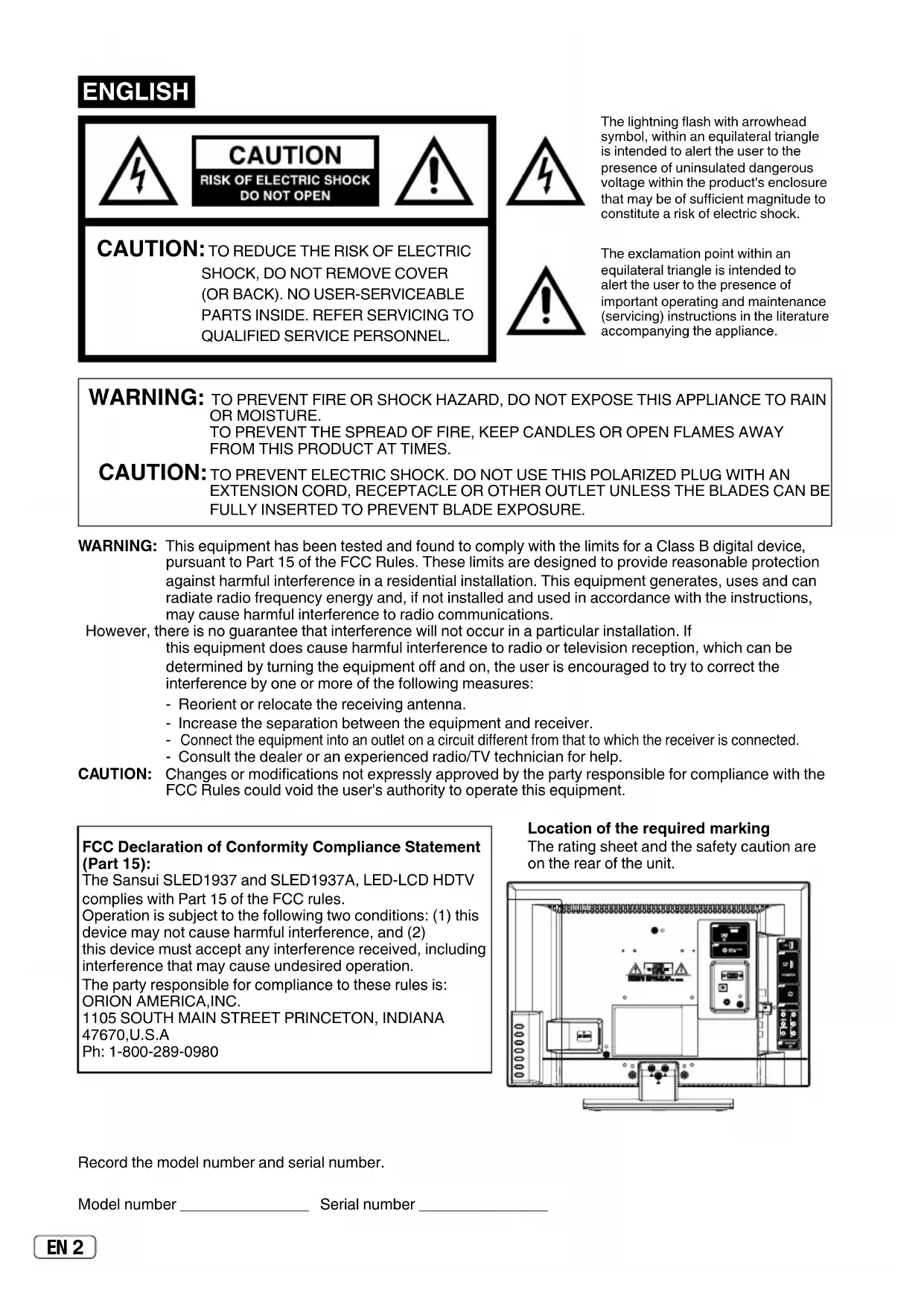 The Sansui SLED1937 and SLED1937A, LED-LCD HDTV complies with Part 15 of the FCC rules.